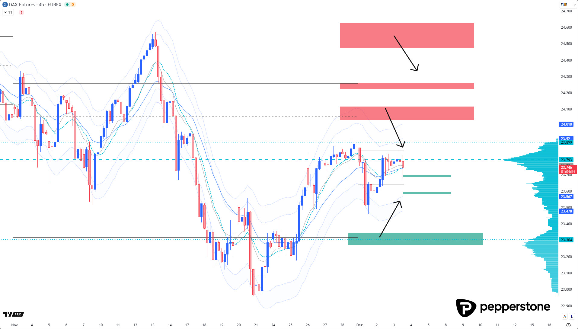 DAX PROGNOSE: Gemäß der aktuellen Handelsausrichtung bleibt der DAX weiterhin aufwärtsgerichtet. Die Entscheidung, die 10- und 20-Tage-EMA als zentrale Orientierungspunkte zu respektieren, erwies sich als richtig. Auf der Unterseite finden sich drei Unterstützungsbereiche: zwei kleinere Zonen bei 23.700 und 23.590 Punkten, an denen sich kurzfristige Reaktionen beobachten lassen könnten, sowie die übergeordnete Hauptunterstützung bei rund 23.300 Punkten, die heute jedoch voraussichtlich nicht erreicht wird. Auf der Oberseite liegt der nächste markante Widerstand an der Quartals-VWAP bei etwa 24.020 Punkten, gefolgt von der Value Area High auf 6-Monats-Basis zwischen 24.220 und 24.260 Punkten.