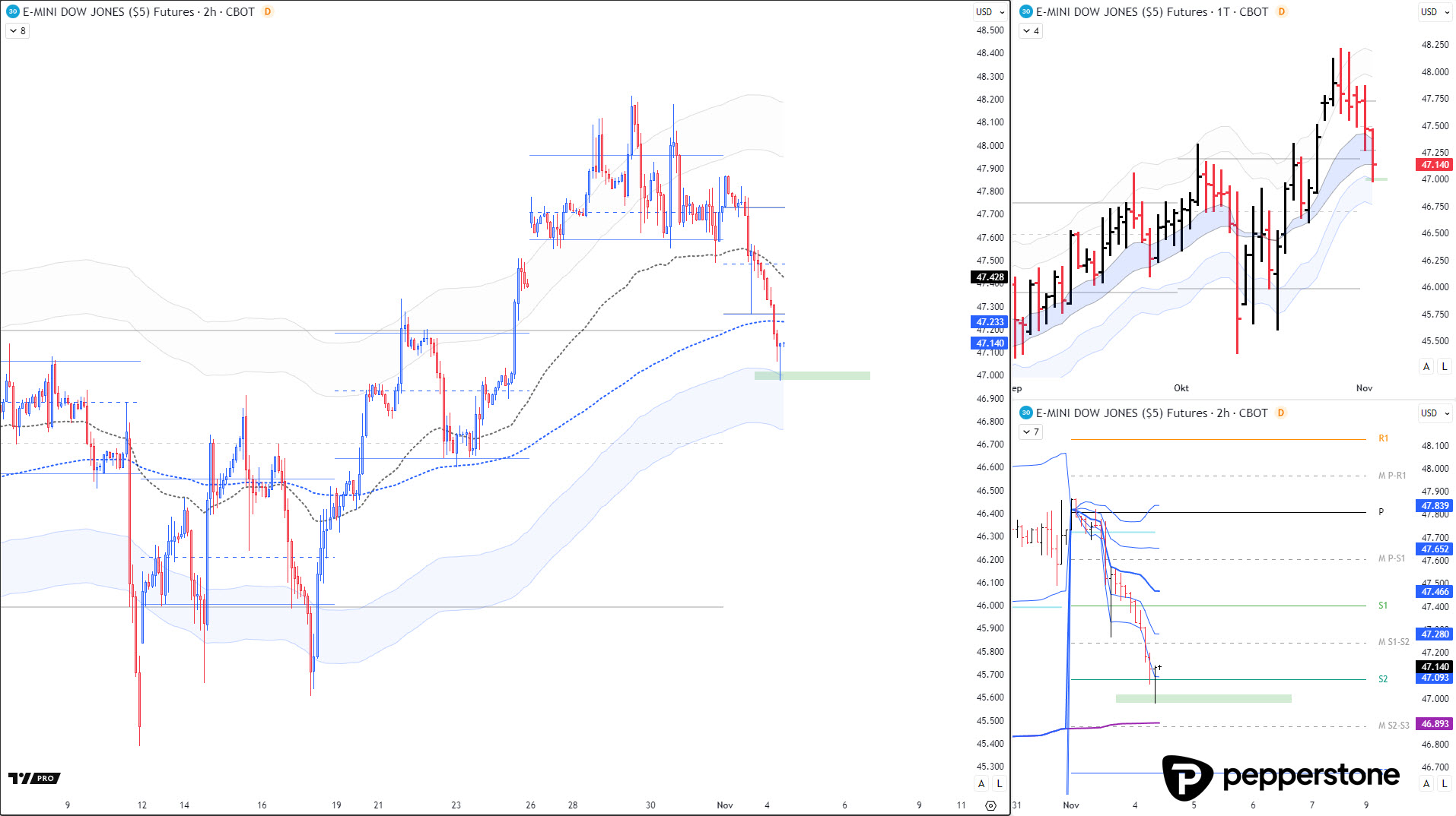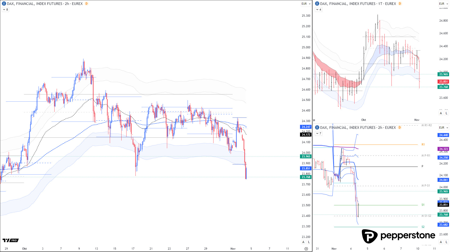 DAX PROGNOSE: Der DAX eröffnet heute deutlich tiefer und zeigt ein hohes Momentum. Der Point of Control des Vormonates könnte hier zu einer Stabilisierung führen. Bei dieser überdehnten Lage, muss heute mit Korrekturen gerechnet werden.