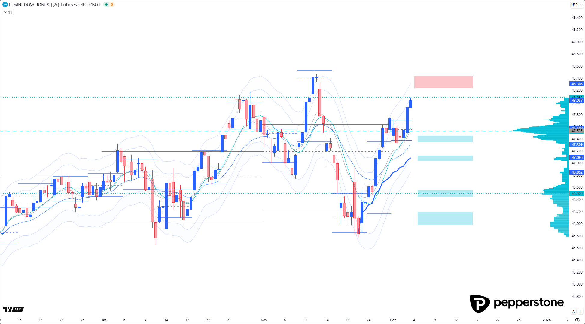 DOW JONES PROGNOSE: Bei den US-Indizes – Dow Jones, S&P 500 und Nasdaq – ist es derzeit sinnvoll, auf eine technisch saubere Korrektur zur H4-EMA20 zu warten. Erst wenn diese Rückläufe erfolgen, entsteht ein attraktives Setup, um im Einklang mit der übergeordneten Aufwärtsstruktur wieder long zu handeln. Der Fokus liegt dabei auf dem regulären US-Handelsfenster zwischen 15:30 und 22:00 Uhr, in dem die entscheidenden Bewegungen typischerweise stattfinden. Vor diesem Hintergrund bleibt Geduld gefragt, bis die Indizes ihre Korrektur abgeschlossen und die relevanten Durchschnittslinien erreicht haben.