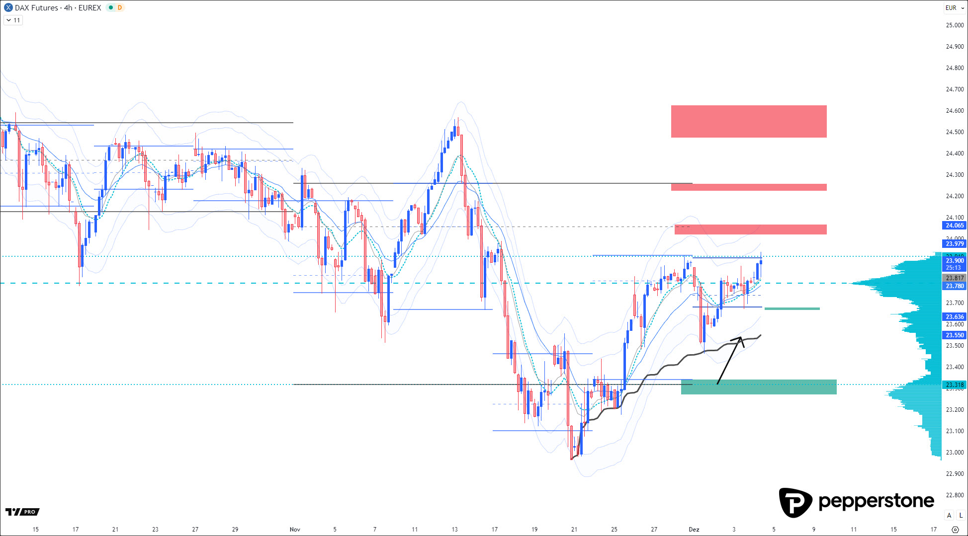 DAX PROGNOSE: Die Unterstützung bei 23.670 Punkten wurde vom DAX punktgenau angelaufen und anschließend mit einem Anstieg von über 300 Punkten bestätigt – ein klarer Beleg für die technische Präzision des Setups. Damit gilt das Szenario als erfolgreich abgeschlossen. Das Marktbild bleibt aufwärtsgerichtet, sowohl im Momentum als auch in der Handelsstruktur. Für neue Einstiege empfiehlt sich daher ausschließlich der Fokus auf Long-Positionen aus tieferen Korrekturen heraus. Relevante Unterstützungen liegen weiterhin bei 23.670 sowie weiter unten bei 23.340 Punkten. Auf der Oberseite markieren die Zonen bei 24.050, 24.250 und 24.560 Punkten die entscheidenden Widerstände für die kommenden Handelstage.