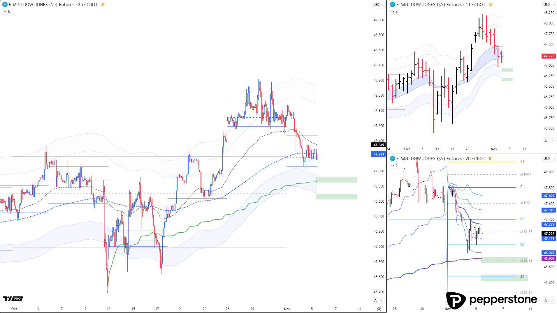 DOW JONES PROGNOSE: Der Dow Jones konnte an den gestrigen Unterstützungszonen sauber reagieren und eine technische Gegenbewegung einleiten. Für den heutigen Handel ergeben sich zwei weitere potenzielle Longbereiche, sofern der Index überhaupt so weit zurücksetzt. Die erste Zone liegt an der Quartals-VWAP im Bereich von rund 46.908 Punkten. Dort verläuft zugleich die Anchored VWAP des Aufwärtsimpulses seit dem 12. Oktober, wodurch dieser Bereich doppelt gestützt ist. Sollte der Markt darunter fallen, rückt die zweite Unterstützungszone in den Fokus: der Wochen-S3 bei rund 46.850 Punkten. Hier befindet sich zusätzlich der Point of Control (POC) des Vormonats, was das Level zu einem markanten Cluster macht. Beide Zonen eignen sich für reaktive Long-Szenarien – vorausgesetzt, es zeigen sich dort klare Bestätigungssignale auf Intraday-Basis.