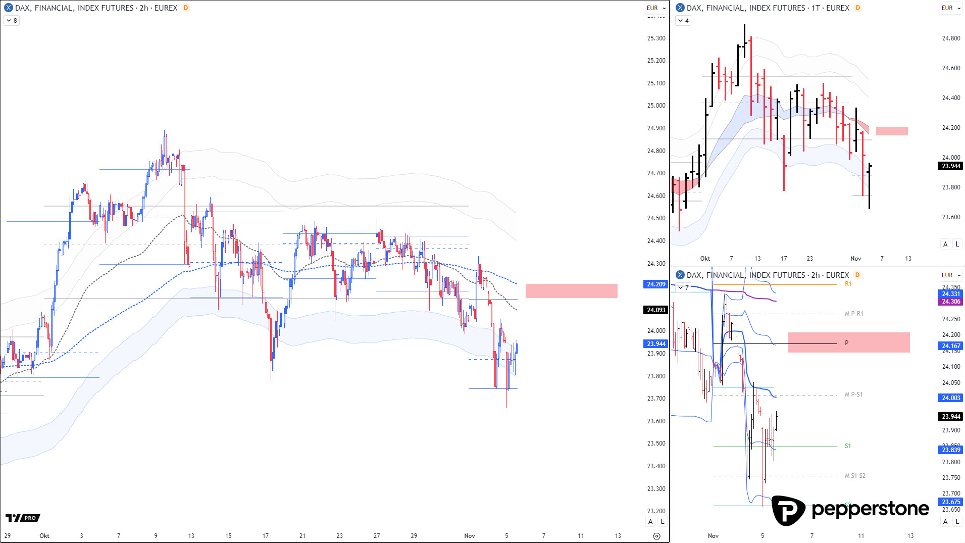 DAX PROGNOSE: Der Index konnte sich erwartungsgemäß am Point of Control (POC) des Vormonats stabilisieren und zeigt dort bislang eine technisch saubere Reaktion. Damit bestätigt sich das bekannte Muster, wonach der POC als kurzfristiger Gleichgewichtspunkt fungiert und Käufer wie Verkäufer gleichermaßen aktiviert. Für den weiteren Verlauf des Handelstages rücken nun zwei potenzielle Shortzonen in den Fokus: Zum einen die erste monatliche VWAP-Ausdehnung – also die Standardabweichung der volumengewichteten Durchschnittslinie – im Bereich von rund 24.090 Punkten. Zum anderen die etwas höher verlaufende Quartals-VWAP bei etwa 24.212 Punkten. Beide Marken besitzen das Potenzial, kurzfristige Gegenbewegungen einzuleiten, insbesondere wenn dort im Intraday-Chart erste Schwächesignale auftreten. Erst eine Bestätigung durch Price Action macht das Setup valide; ohne Reaktion bleibt der Bereich vorerst rein beobachtungsrelevant.