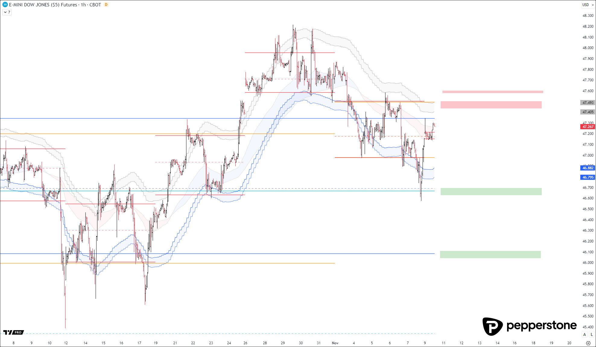 DOW JONES PROGNOSE: Auch der Dow Jones zeigte zum Wochenauftakt eine Erholung von den Unterstützungsbereichen des Freitags. Ausschlaggebend war dabei die deutliche Reaktion an der markanten Volumenzone – insbesondere am Point of Control auf 3-Monatsbasis, der als zentrales Gleichgewichtsniveau fungierte. Für die laufende Woche liegen die relevanten Widerstände im Bereich von etwa 47.400 und 47.600 Punkten, während sich auf der Unterseite Unterstützungen zwischen 46.700 und 46.100 Punkten ausmachen lassen.