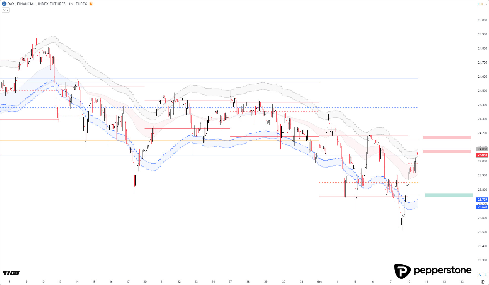 DAX PROGNOSE: Der DAX bleibt weiterhin im Abwärtstrend, zeigte jedoch infolge der stark überverkauften Marktsituation eine technisch saubere Erholung. Aktuell lassen sich zwei markante Widerstandsbereiche identifizieren – bei 24.050 sowie 24.160 Punkten. Sollte der Index diese Niveaus anlaufen und gleichzeitig auf den kleineren Zeiteinheiten Umkehrformationen ausbilden, ergeben sich dort interessante Short-Gelegenheiten. Auf der Unterseite bildet die Value Area Low des Monats bei etwa 23.800 Punkten eine solide Unterstützungszone, die für eine potenzielle Gegenreaktion relevant ist.