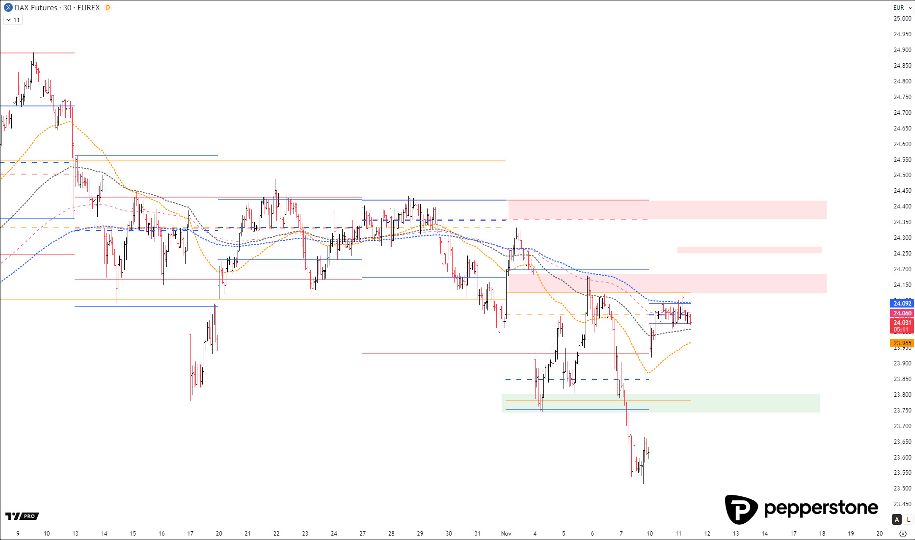 DAX PROGNOSE: Das Marktbild zeigt weiterhin eine seitwärts bis abwärts tendierende Struktur. Gerade in solchen Phasen führen kurzfristige, impulsartige Bewegungen oft zu unnötigen Stop-Outs, wenn man sich zu früh oder am falschen Ort positioniert. Mein Fokus liegt daher auf klar überdehnten Preiszonen, vorzugsweise in der zweiten Tageshälfte, wenn der Markt diese Bereiche technisch sauber anlaufen kann. Erst bei einer bestätigten Reaktionsstruktur auf den kleineren Zeiteinheiten ergibt sich ein sinnvoller Einstieg – ohne diese Bestätigung bleibt die Positionierung tabu.