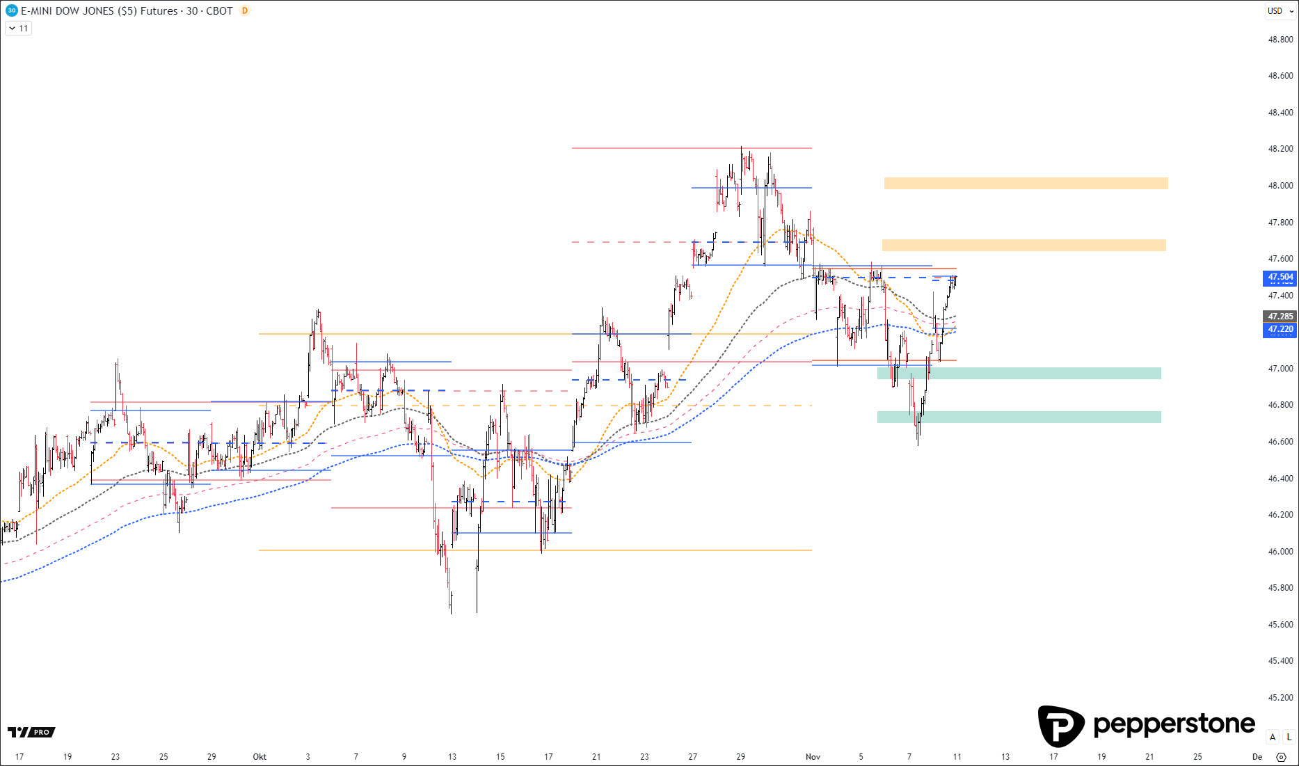 DOW JONES PROGNOSE: Der Dow Jones bewegt sich aktuell in einer ausgeprägten Seitwärtsstruktur. Schnelle Verkaufsbewegungen werden unmittelbar neutralisiert, doch das Gesamtbild bleibt unverändert. Wer den Chart mit etwas Abstand betrachtet, erkennt klar die anhaltende Seitwärtstendenz. In dieser Marktphase wähle ich – analog zum DAX – ausschließlich die Extrembereiche für mögliche Einstiege, da das Handeln zwischen den Zonen erfahrungsgemäß zu unkontrollierten Fehlsignalen und unnötigem Stop-Hunting führt.