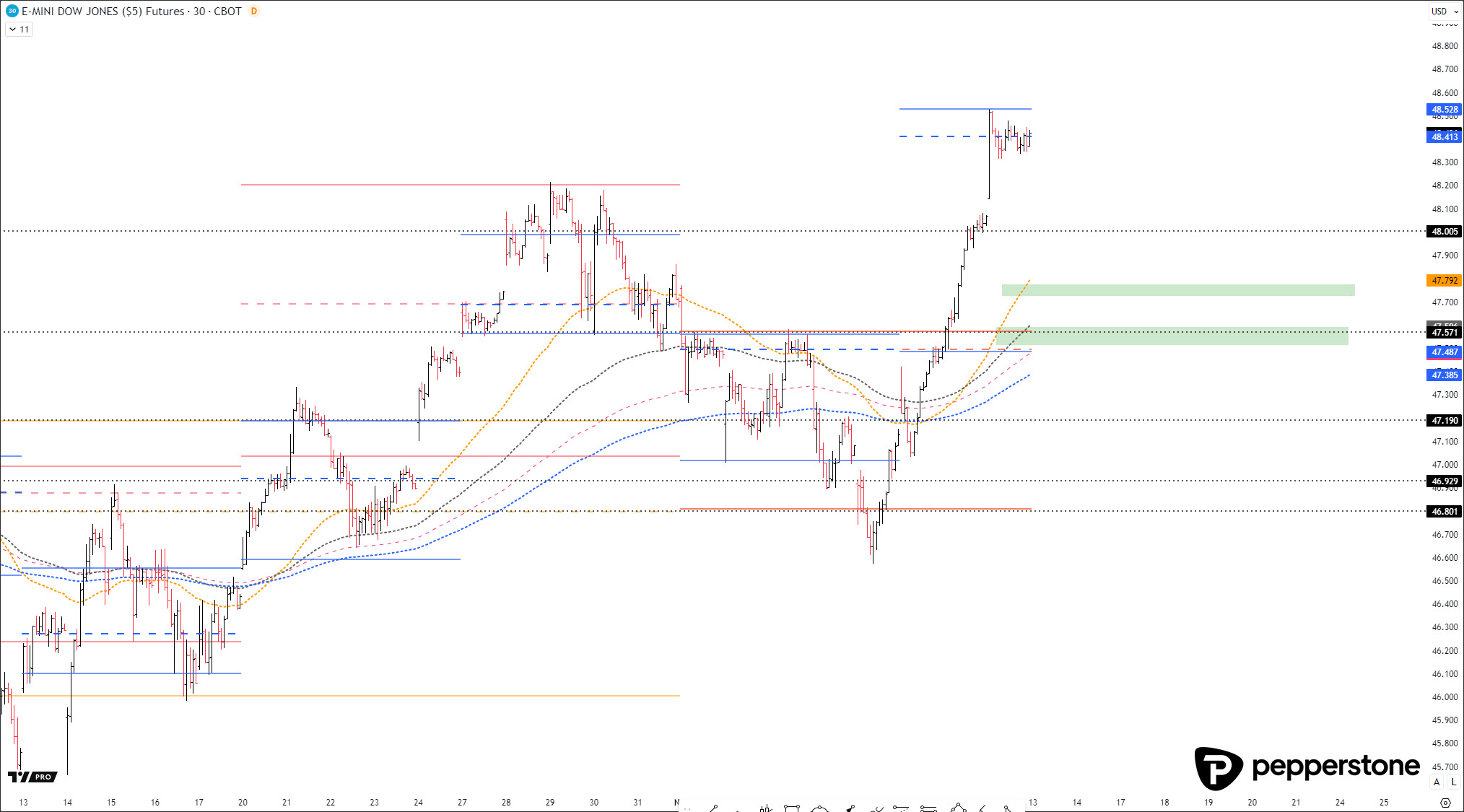 DOW JONES PROGNOSE: Der Dow Jones ist gemäß dem Trend einfach weitergelaufen. Ich warte hier weiterhin auf einen Rücklauf in die eingezeichneten Zonen, um aus der Korrektur heraus einen Longtrade anzuvisieren. Shortpositionen gegen den Trend und das Momentum sind (offensichtlich) hochriskant und werden von mir (zu 99%) ausgelassen.