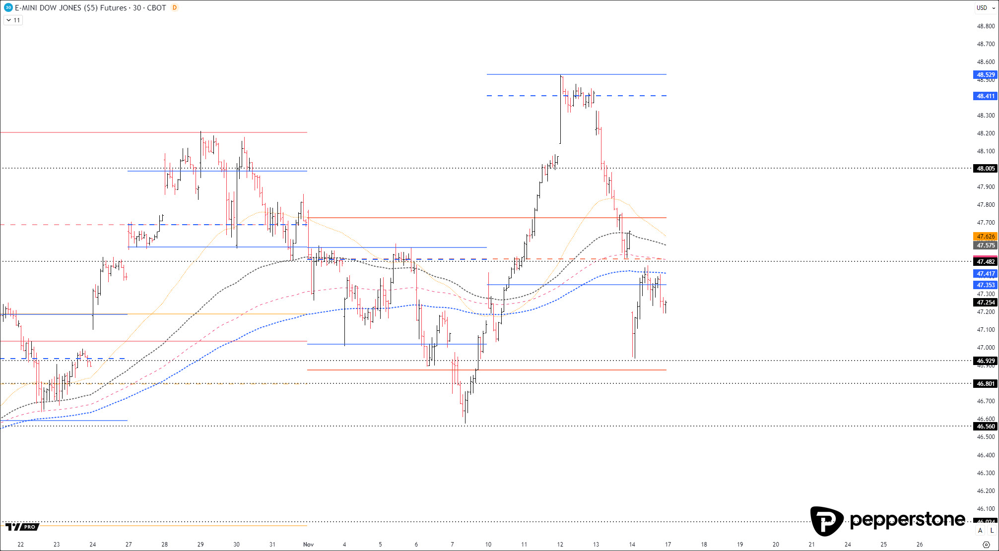DOW JONES PROGNOSE: Im Gegensatz zum DAX zeigt der Dow Jones weiterhin eine übergeordnete Aufwärtstendenz, auch wenn sich zuletzt eine gewisse Stagnation bemerkbar macht. Angesichts des kräftigen Anstiegs von rund 30 Prozent seit April ist diese Konsolidierung jedoch wenig überraschend – zumal auch der Nasdaq 100 im gleichen Zeitraum um mehr als 55 Prozent zulegen konnte. Die aktuellen Rückläufe sind somit als gesunde Reaktion auf die vorangegangene Überdehnung zu interpretieren. Das Marktumfeld ist derzeit eher korrektiv geprägt, mit einer sich abzeichnenden leichten Seitwärtsneigung. Entsprechend bleibt es auch hier ratsam, nur an den äußeren Grenzen aktiv zu werden und nicht in der Mitte dieser Korrektur zu handeln. Wer dort positioniert ist, läuft Gefahr, von den typischen Ausschlägen innerhalb der Spanne zerrieben zu werden. Daher gilt dasselbe taktische Vorgehen wie im DAX: abwarten, bis markante Zonen angelaufen werden, und erst dort auf bestätigte Umkehrsignale reagieren.