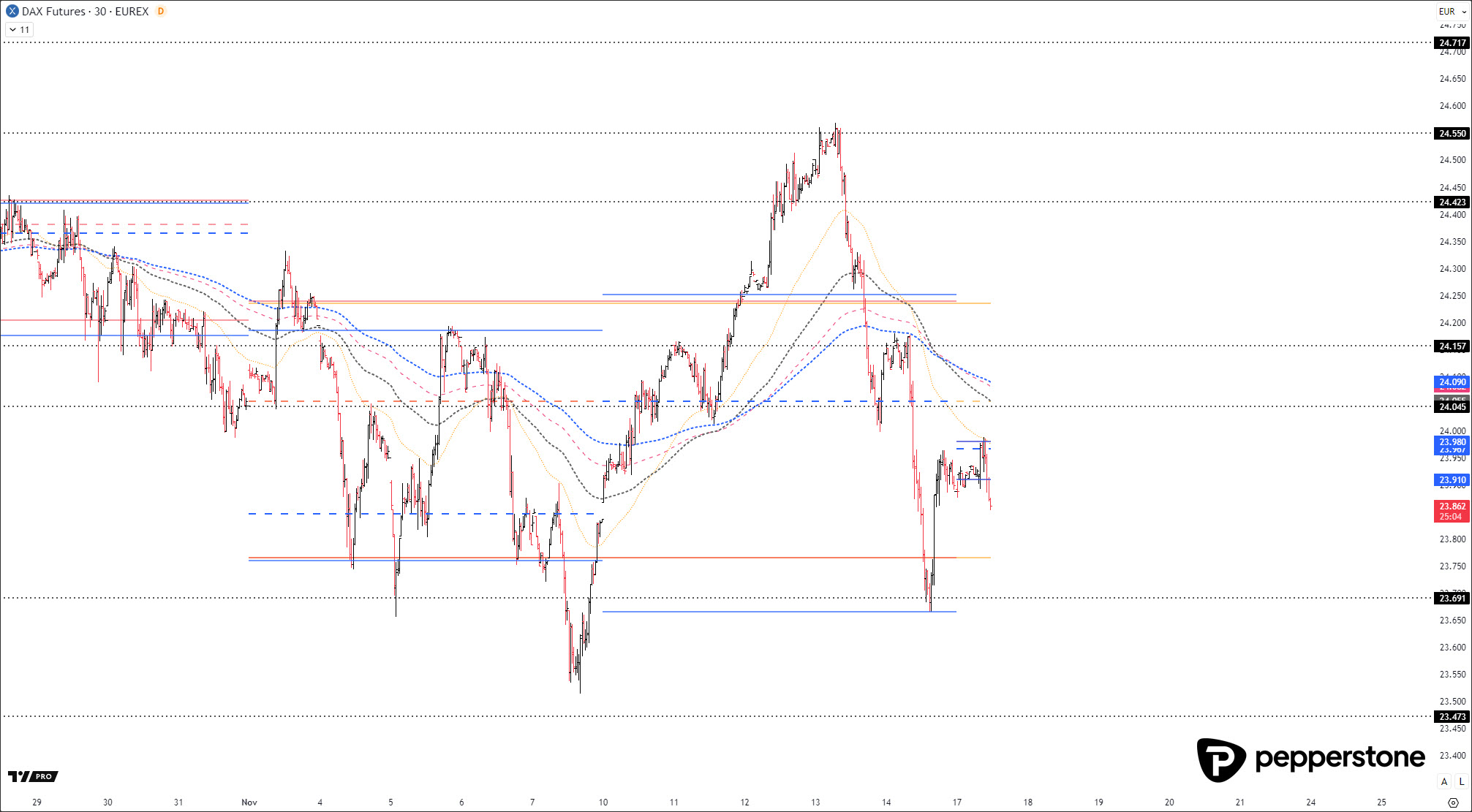 DAX PROGNOSE: Der DAX bewegt sich weiterhin innerhalb der breiten Seitwärtsrange zwischen 23.450 und 24.700 Punkten. Diese Spanne ist geprägt von abrupten Richtungswechseln und klaren Reaktionen an den jeweiligen Extrempunkten. Besonders relevant sind dabei die Value Area High des laufenden Jahres bei rund 24.650 Punkten sowie die Value Area Low der letzten Monate bei etwa 23.700 Punkten. Auf der Oberseite begrenzen sowohl die Jahres-Value-Area-High als auch die der letzten drei Monate den Markt deutlich, während die Value Area Low derselben Periode eine starke Unterstützung bildet. Entsprechend bleibt es sinnvoll, Positionierungen nur an den äußeren Rändern der Range zu suchen – zunächst abwartend und dann bei bestätigten Umkehrsignalen. Besonders im Bereich von 23.490 und 23.300 Punkten liegen markante Unterstützungen, die bei einer Reaktion taktisch interessant werden könnten. Innerhalb der Range zu handeln ist dagegen riskant, da dort scharfe Gegenbewegungen häufig in die Extreme ausschlagen und unvorteilhafte Zwischenpositionen erzeugen.