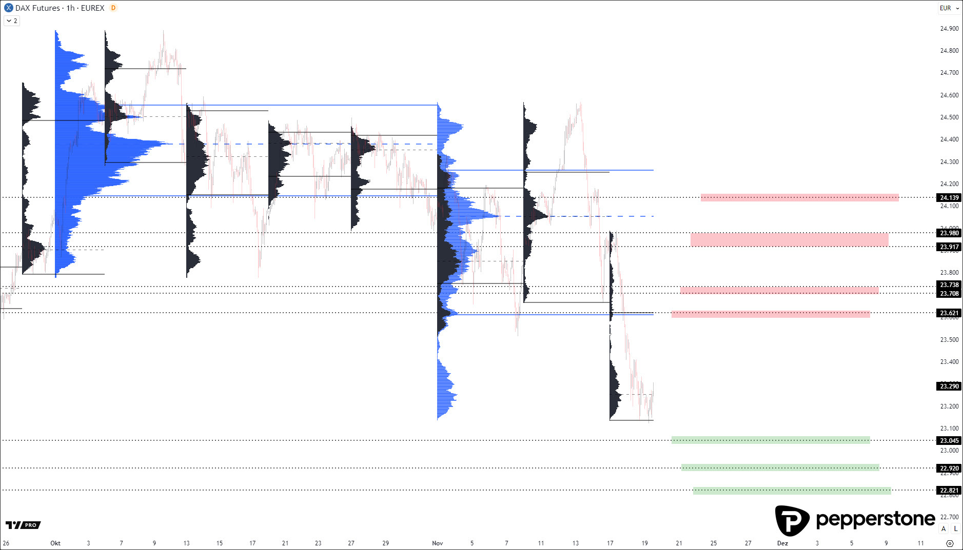 DAX PROGNOSE: Die Märkte bewegen sich weiterhin in einer sauberen Korrektur. Das überrascht nicht: Übergeordnet sind viele Indizes heiß gelaufen und benötigen eine Abkühlung, die sich nun in Form eines untergeordneten Abwärtstrends zeigt. Mit jeder weiteren Korrekturwelle nähern sich die großen Benchmarks zunehmend zentralen Unterstützungsbereichen – ein Umfeld, das typischerweise langsame, kontrollierte Rückläufe begünstigt. Im DAX sind die nächsten markanten Unterstützungen bei 23.040, 22.920 und 22.820 Punkten zu finden. Läuft der aktuelle Abwärtstrend in diese Bereiche hinein, ergeben sich dort erste Chancen für Reversal-Trader – allerdings nur bei klarer Bestätigung im kleinen Zeitfenster. Kurzfristig bleibt die bevorzugte Handelsrichtung jedoch abwärts. Sollte der Markt eine höhere Gegenbewegung starten, wären vor allem die Zonen bei 23.620 und 23.720 Punkten interessante Short-Level. Diese Bereiche definieren die operative Struktur des heutigen Handelstages.