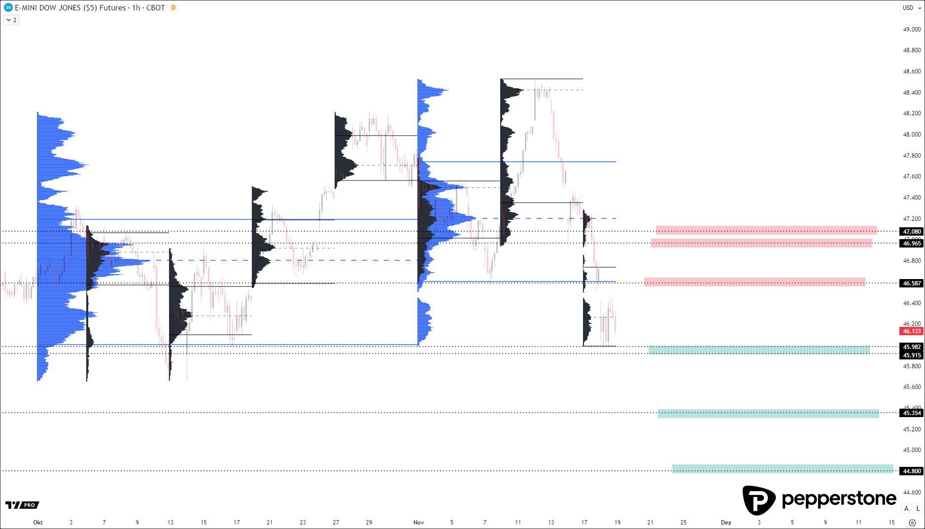 DOW JONES PROGNOSE: Die Volumenstruktur im Dow Jones ähnelt derzeit stark dem Bild im DAX: Der Index befindet sich in einem klaren, untergeordneten Abwärtstrend, während sich drei markante Unterstützungszonen als potenzielle Startpunkte für kurzfristige Erholungen herauskristallisieren. Diese liegen bei 45.920, 45.350 und 44.800 Punkten. Auf der Oberseite werden Short-Setups vor allem bei 46.590 Punkten sowie im kräftigen Widerstandsbereich zwischen 46.950 und 47.050 Punkten interessant.