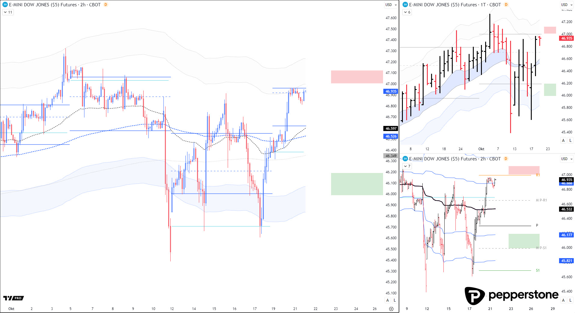 DOW JONES PROGNOSE: Die Handelsausrichtung ist gegenwärtig seitwärts / leicht steigend. Die Handelszonen orientieren sich an den Schwankungsgrenzen (Unfair-Value Band) als auch an der Value Area High bzw. Low des Monats.