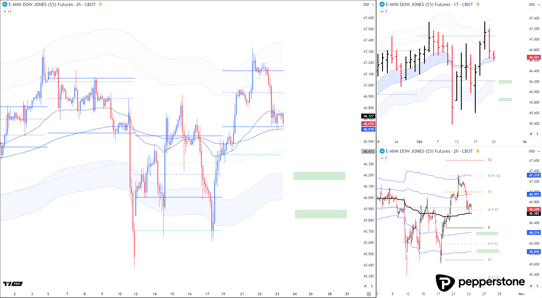 DOW JONES PROGNOSE: Seitwärts schwankend präsentiert sich auch der DOW JONES. Ich werde hier versuche keinerlei Positionen innerhalb der großen Range aufzubauen, sondern nur an den äußeren temporären Grenzen zu agieren. Einstiege sind an den VWAP-Ausdehnungen, Chart 3 – rechts unten.
