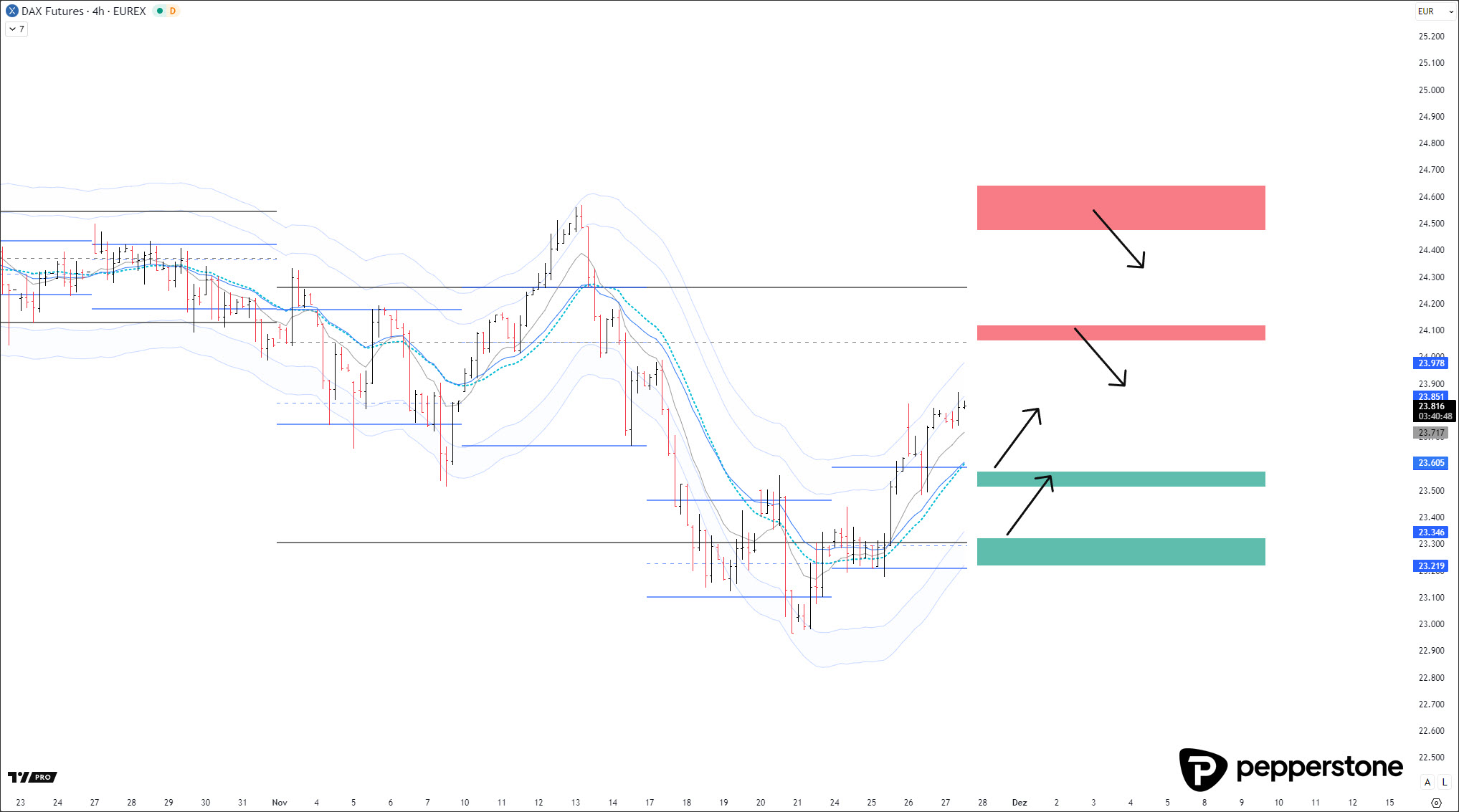 DAX PROGNOSE: Das H4-Momentum zeigt inzwischen eine klare Aufwärtsneigung, wodurch sich neue Long-Ansätze anbieten. Besonders interessant sind die Bereiche rund um die H4-EMA20 sowie die Tages-EMA10, da hier klassische Korrektur-Setups entstehen können. Eine zusätzliche Unterstützung ergibt sich an der Value Area Low des einmonatigen Volumenprofils, womit auf der Unterseite zwei technisch saubere Reaktionszonen definiert sind.