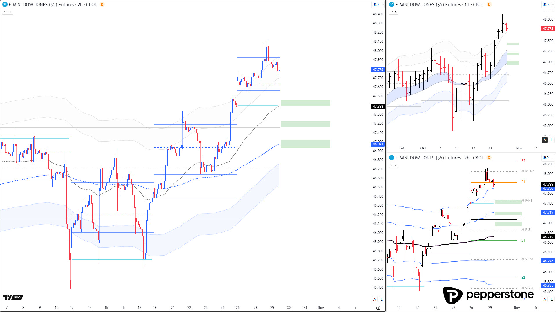 DOW JONES PROGNOSE: Aus der letzten Korrektur heraus, läuft der Impuls weiterhin. Shortpositionen bergen ein zu hohes Risiko und Longpositionen sind definitiv zu teuer.