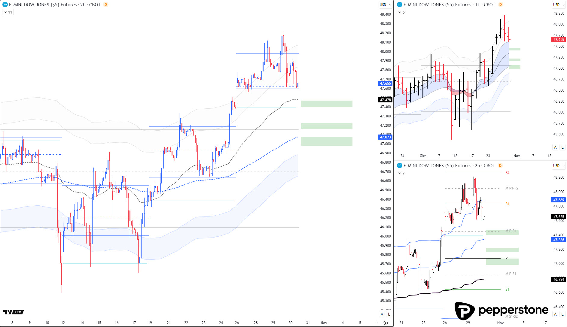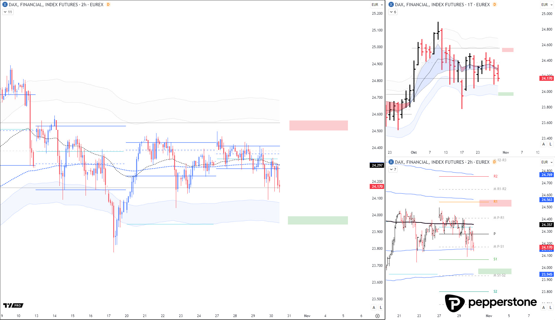 DAX PROGNOSE: Wer jetzt aktuell eher das Signal suchend unterwegs ist, wird im DAX fast jeden Tag enttäuscht, da dieser sich gegenwärtig nicht mehr bewegt. In solchen Phasen bin ich nur bereit an ausgedehnten Zonen zu handeln (siehe Chart 3, rechts unten, VWAP-Ausdehnungen). Der DOW JONES hat gestern auf Tagesprognose sowohl die Short- als auch die Longzonen abgehandelt. Entsprechend ratsam ist das Legen von Alarmen, weil des den Handelsdruck nimmt.