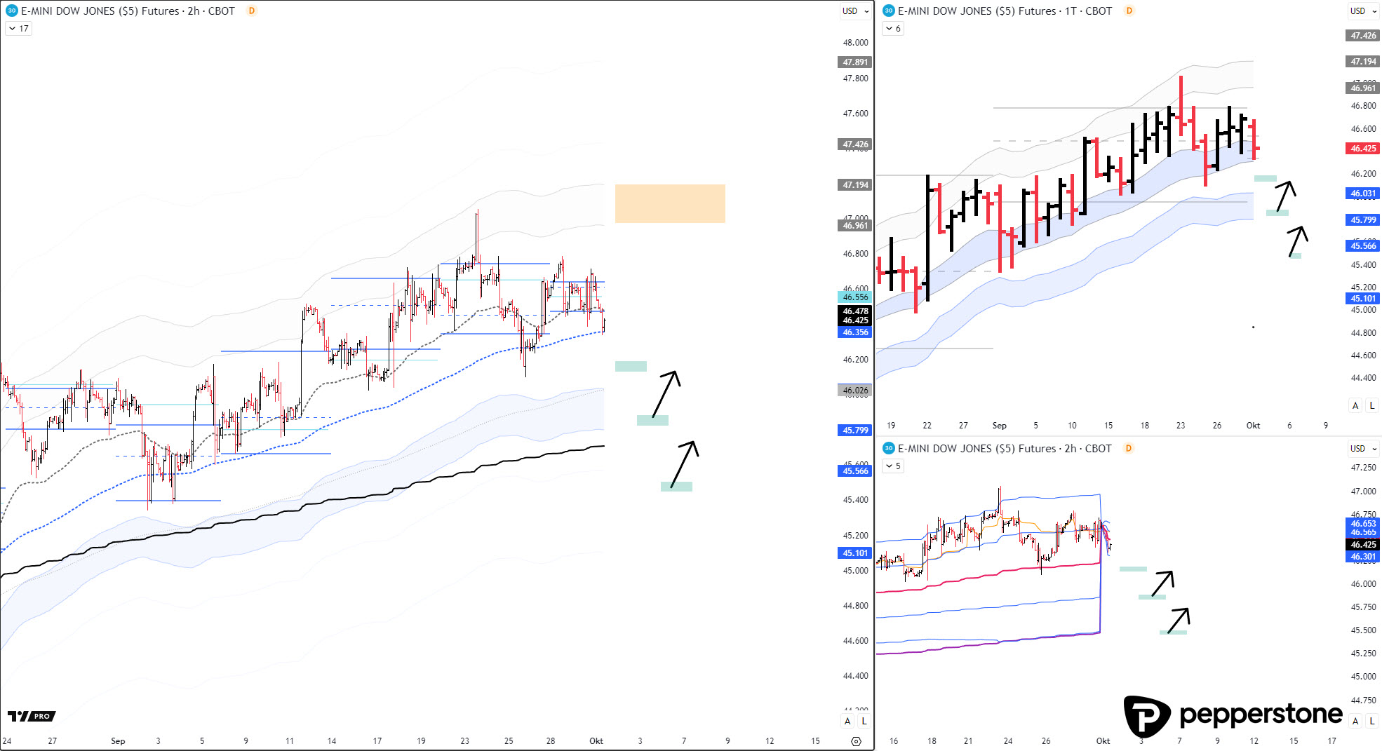 DOW JONES PROGNOSE: Die Charts wurden aktualisiert, die Handelsausrichtung bleibt unverändert steigend. Allerdings fehlt hier eine tiefere Korrektur, um aus einer günstigen Verortung heraus zu handeln. Auch zur Überdhnungszone (Orange) für mögliche (riskante) Shortpositionen ist noch eine zu große Distanz.