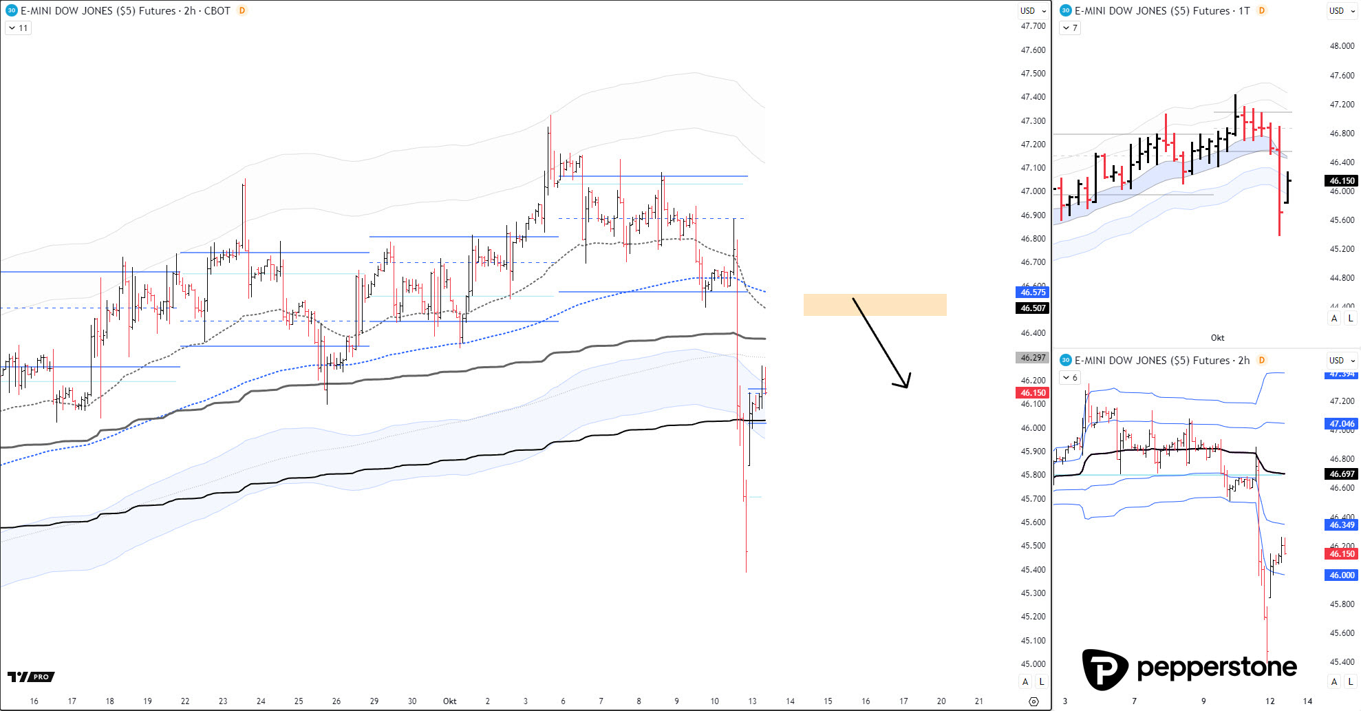 DOW JONES PROGNOSE: Die Handelsausrichtung ist zunehmend abwärtsgerichtet (Gleitende Durchschnitte, Marktstruktur, Value Area). Höhere Rückläufe in den Bereich von anfangend 46.500 Punkten werden für Shortpositionen relevant.