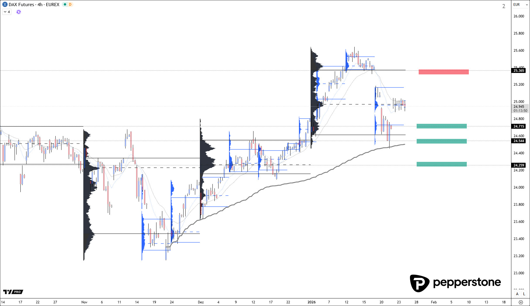 Ausgehend von der aktuellen Handelsspanne von etwa 1 % bis 1,5 % sowie den abgeleiteten Marken aus Volumenprofil- und TPO-Analyse lassen sich zwei zentrale Orientierungszonen definieren. Auf der Oberseite liegen relevante Widerstände ab etwa 25.350 Punkten, während sich auf der Unterseite ein Unterstützungsbereich zwischen 24.700 und 24.520 Punkten erstreckt. Erst an diesen Zonen entsteht wieder ein strukturierter Entscheidungsrahmen.
