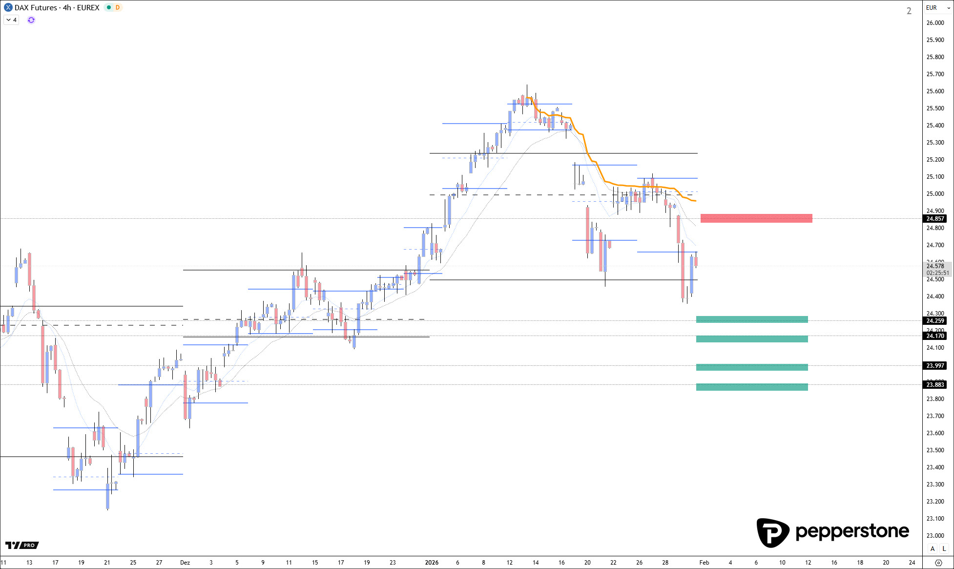 Auf der Oberseite wartet Widerstand bei 24.850 Punkten sowie im Bereich zwischen 24.960 und 25.030 Punkten. Ein echtes Premium-Szenario würde sich erst dann ergeben, wenn der Markt völlig überzieht und über 25.220 Punkte hinausläuft. Das wäre eine klassische Überdehnung, ideal für eine hochwertige Short-Verortung. Realistisch betrachtet ist dieses Szenario derzeit allerdings eher theoretisch.