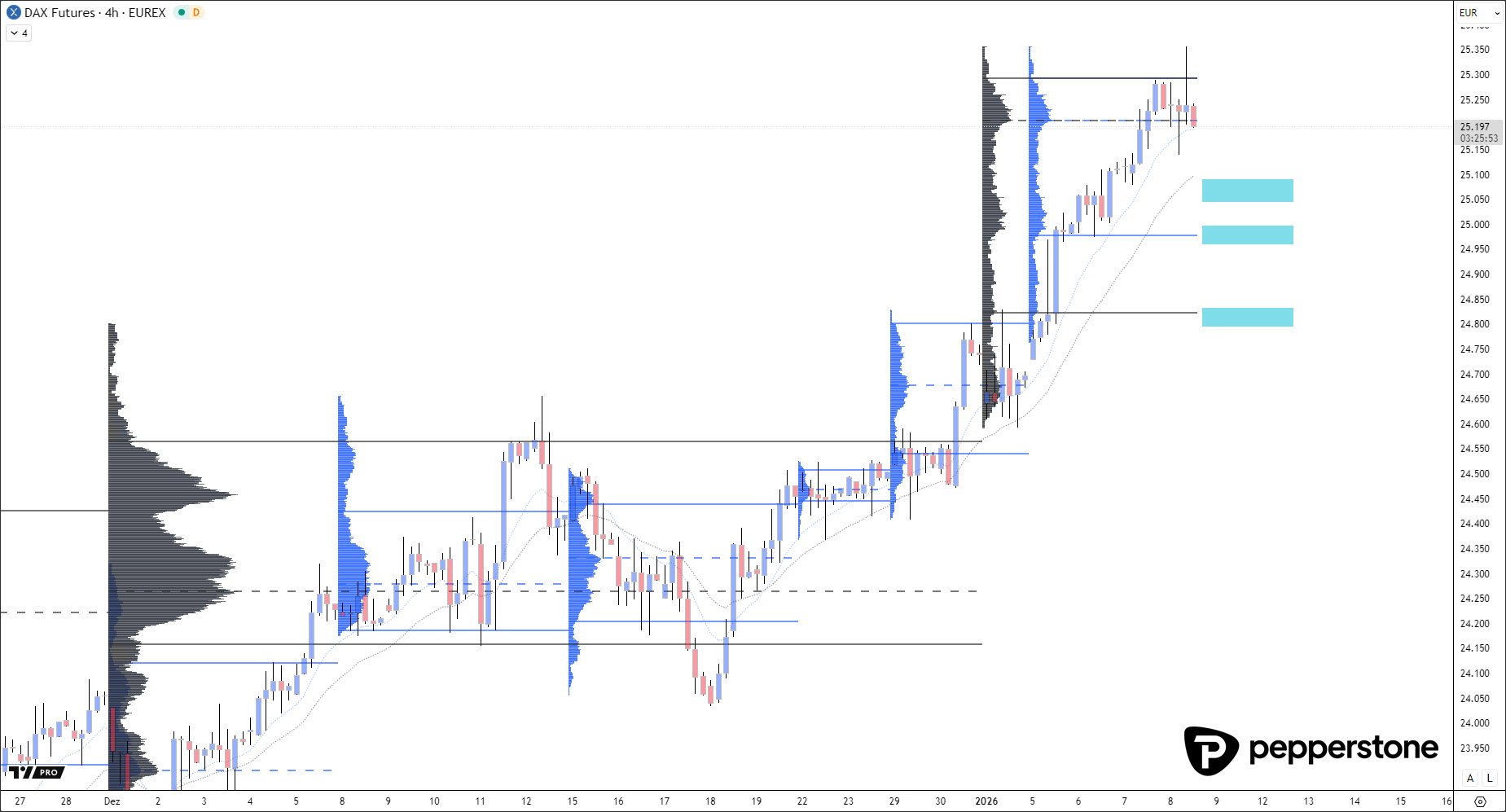 Ungeachtet des intakten Momentums ist der DAX aktuell klar überbewertet, weshalb neue Long-Positionen auf dem aktuellen Niveau nicht attraktiv sind. Mein Fokus liegt daher auf drei technisch relevanten Unterstützungszonen: der H4-EMA20 in Kombination mit der Wochen-VWAP bei etwa 25.070 Punkten, der Value Area Low der laufenden Woche bei 24.960 Punkten sowie der kombinierten Value Area Low des Monats und Value Area High der letzten Dezemberwoche bei rund 24.790 Punkten. Das Momentum bleibt der Kompass – dagegen zu handeln ist keine Option, der aktuelle Preis jedoch zu hoch für neue Einstiege.