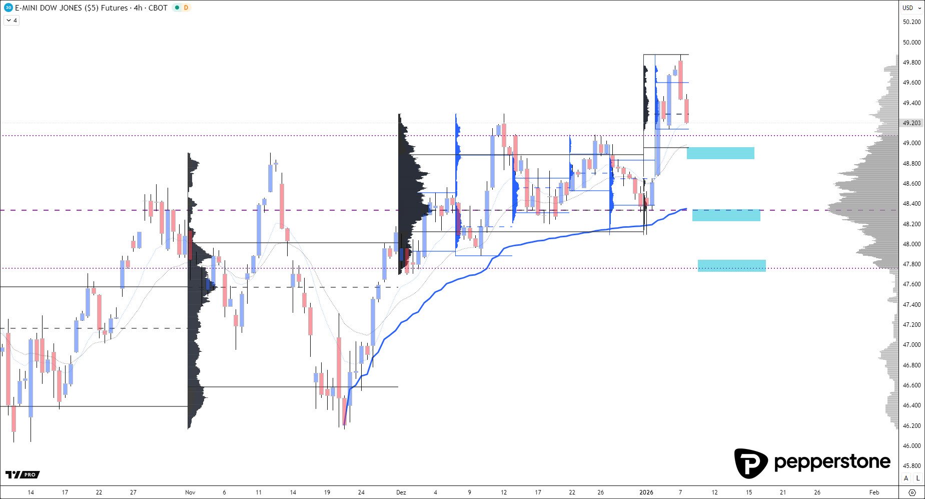 Für den heutigen Handelstag ergeben sich drei klar definierte Unterstützungsbereiche. Zum einen die H4-EMA20 bei rund 48.940 Punkten, die als erste dynamische Unterstützung fungiert. Darunter liegt ein kombinierter Bereich aus Anchored VWAP und der Value Area Low des Monats Dezember zwischen etwa 48.290 und 48.140 Punkten. Eine weitere, tieferliegende Unterstützung befindet sich bei rund 47.760 Punkten. Erst in diesen Zonen wird eine Neubewertung sinnvoll.