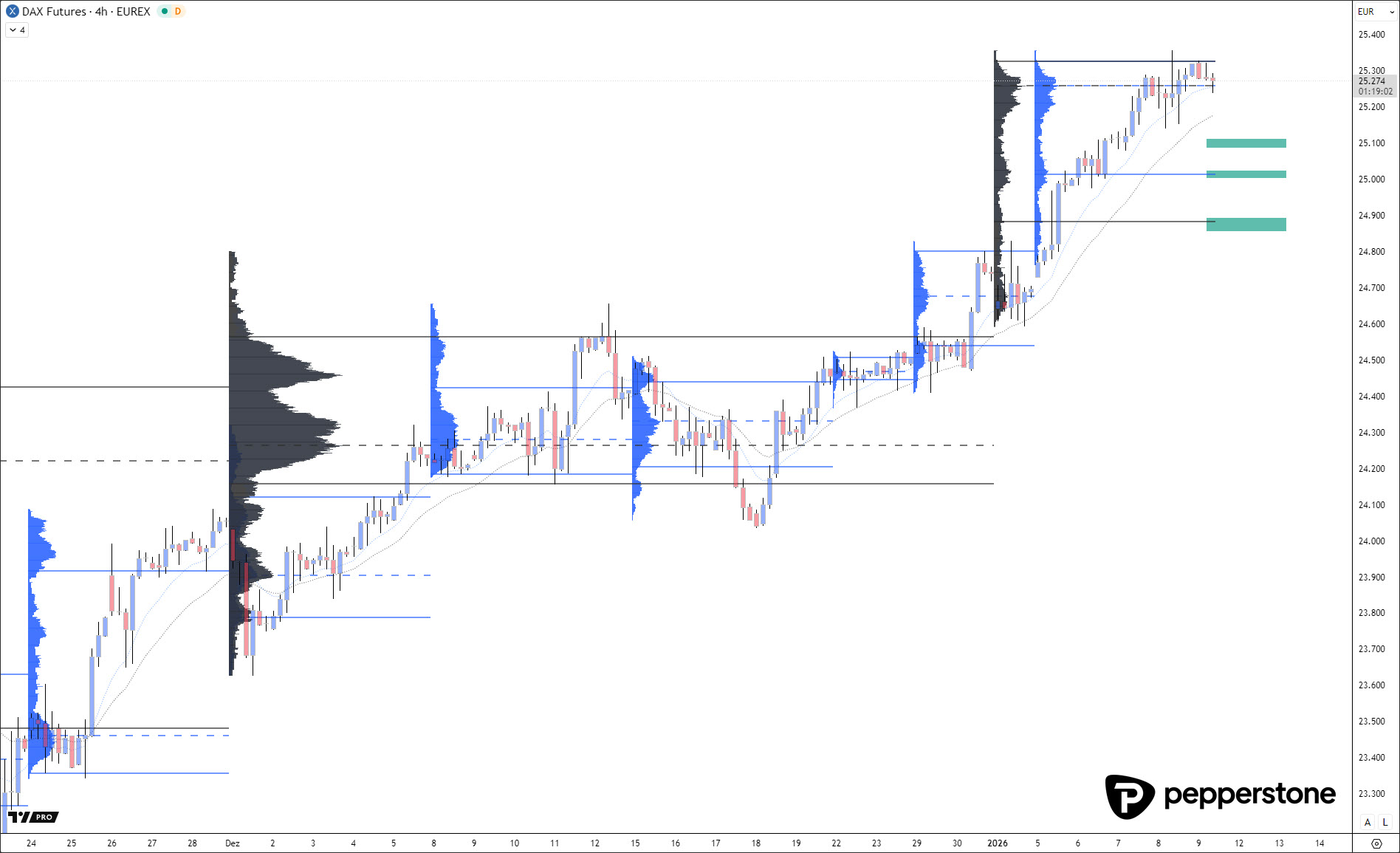 Unverändert gilt jedoch: Der Versuch, gegen das bestehende Momentum das Hoch zu antizipieren, ist statistisch nachteilig. Solange die Marktmechanik aufwärtsgerichtet bleibt, ist Gegentrendhandel nicht sinnvoll. Der strukturell saubere Ansatz besteht weiterhin darin, auf Korrekturen zu warten und daraus trendkonform zu agieren. Relevante Unterstützungszonen liegen dabei bei 25.100, 25.020 und 24.884 Punkten.