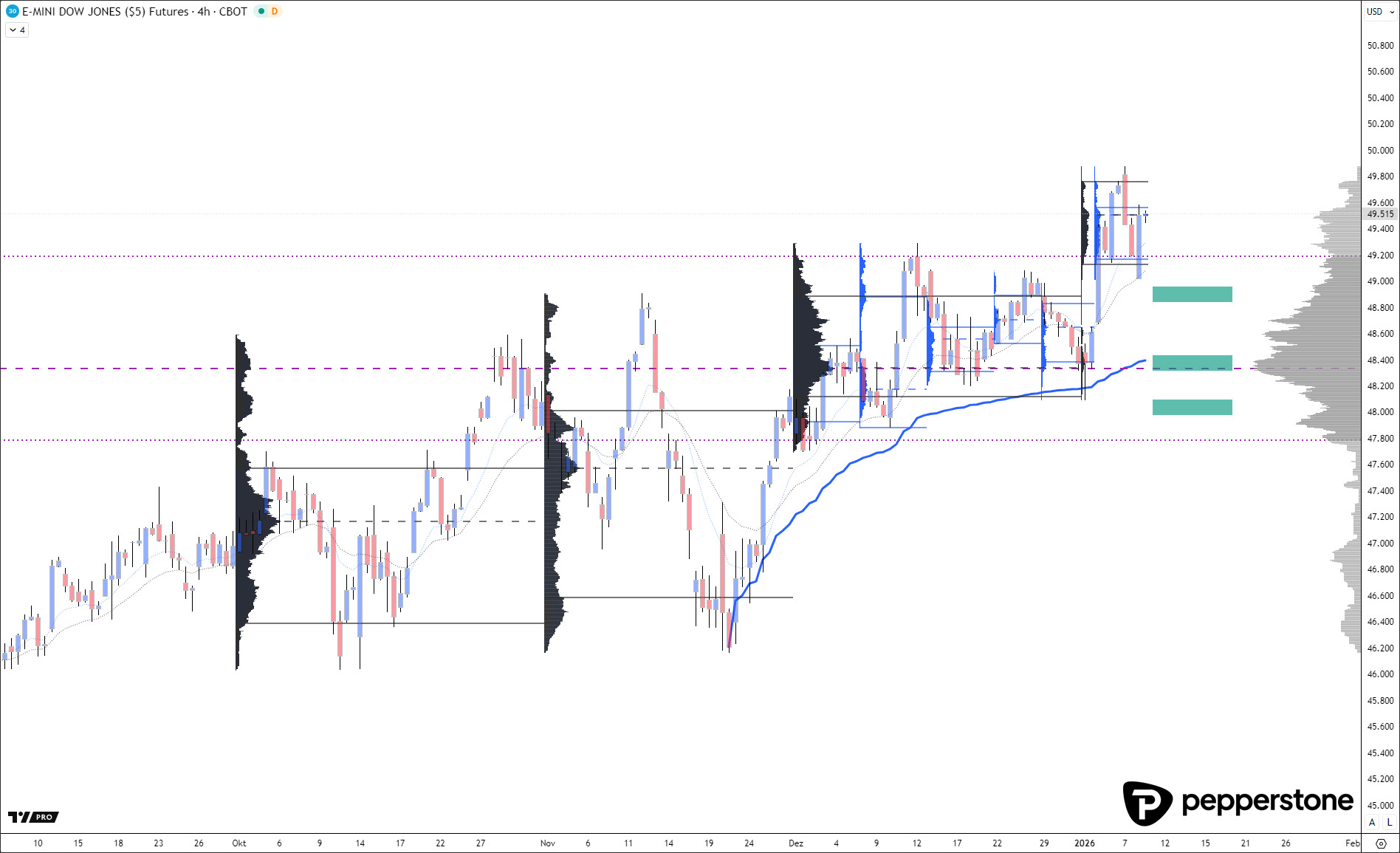DOW JONES PROGNOSE: m Dow Jones lassen sich aktuell drei klar definierte Unterstützungsbereiche identifizieren, die für die weitere Marktbeobachtung relevant sind. Die erste und kurzfristig wichtigste Zone ergibt sich aus der Überlagerung der Tages-EMA20 mit der Value Area High des letzten Quartals beziehungsweise des Monats Dezember. Beide Marken verlaufen gebündelt im Bereich von rund 48.887 Punkten und bilden damit eine primäre Reaktionszone.