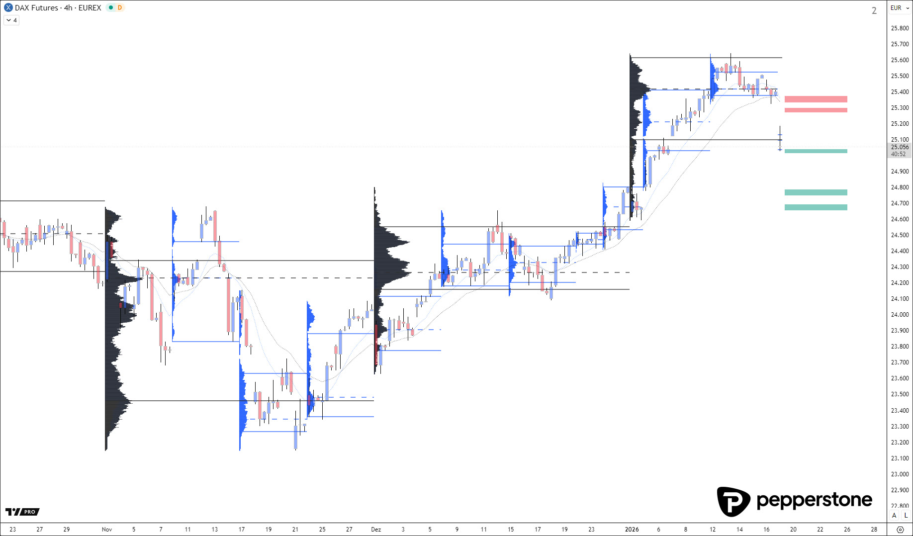 Aus Sicht des Volumenprofils sowie des TPO-Charts lassen sich nun zwei weitere markante Unterstützungsbereiche ableiten. Diese liegen bei 24.770 Punkten sowie etwas tiefer bei 24.680 Punkten. Sollten die Abgaben an Dynamik gewinnen, bilden diese Zonen den nächsten strukturellen Reaktionsraum, in dem sich das Chancen-Risiko-Verhältnis wieder verbessern würde.