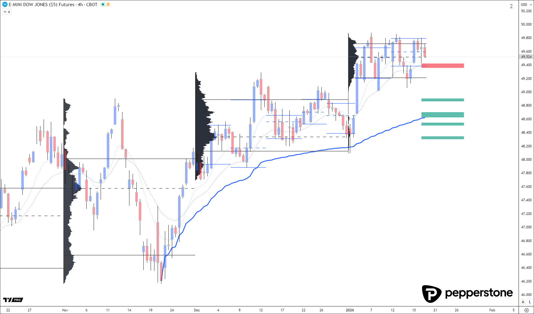Auf der Oberseite ergibt sich im Bereich der H4-EMA20 in Kombination mit der Value Area Low der Vorwoche eine potenziell interessante Zone für kurzfristige Short-Szenarien. Dieser Bereich liegt um 49.390 Punkte und besitzt aufgrund der Überlagerung mehrerer technischer Faktoren ein erhöhtes Reaktionspotenzial, sofern der Markt dorthin zurückläuft und Schwäche zeigt.
