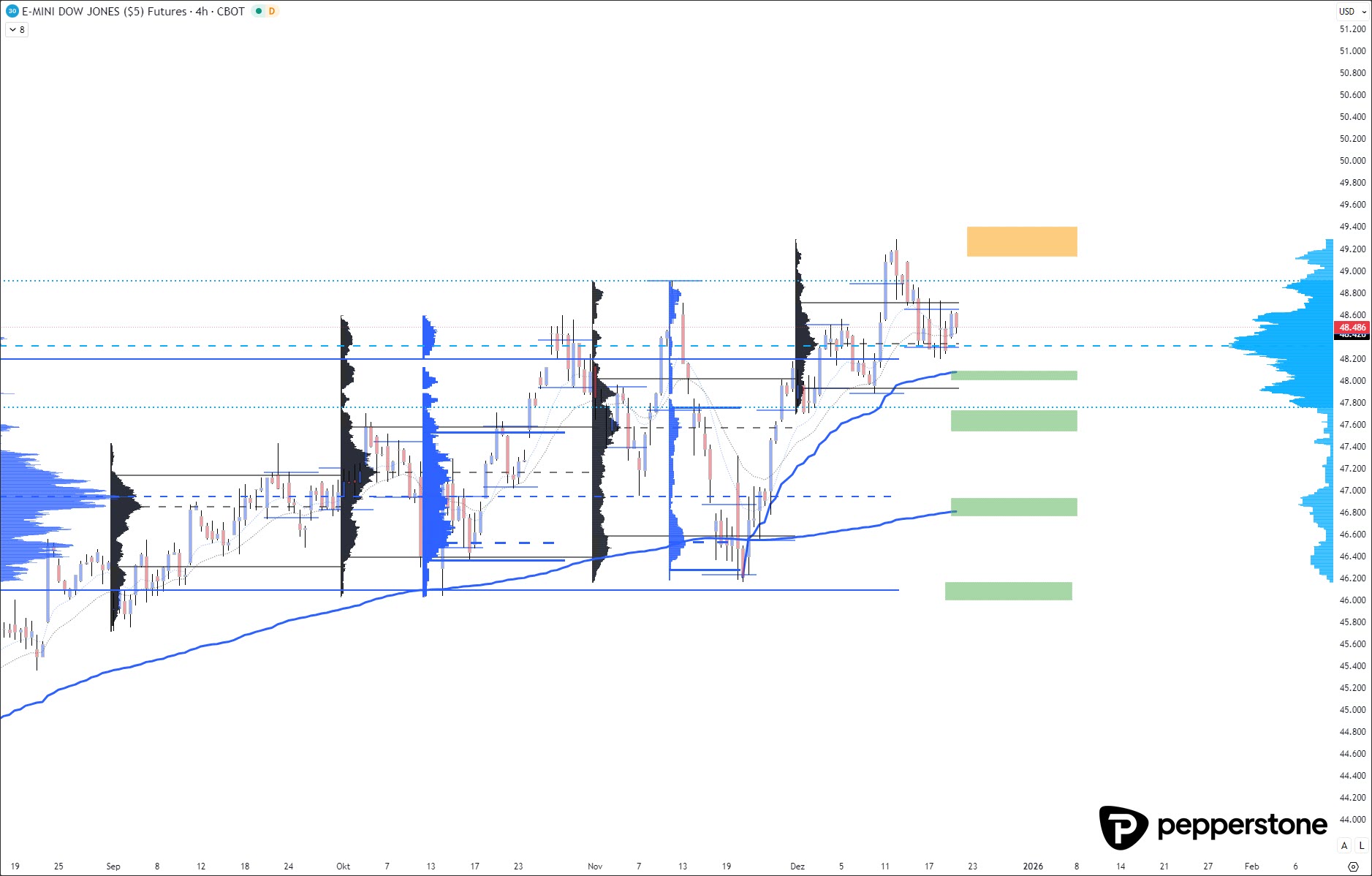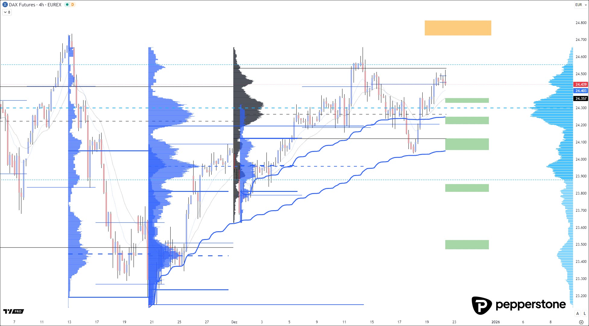 Direkt unterhalb dieser Zone folgen mit der Quartals-VWAP sowie der Value Area Low der Vorwoche bei etwa 24.210 Punkten zwei weitere relevante Unterstützungen. Ergänzend gewinnt die Value Area Low des Monats bei rund 24.117 Punkten an Bedeutung, insbesondere in Kombination mit der dort verlaufenden Anchored VWAP vom 21. November. Diese drei Ebenen bilden zusammen die maßgeblichen Handelsebenen auf der Unterseite und sind prädestiniert für kurzfristige Reaktionen, sofern der Markt dort entsprechende Bestätigung liefert.