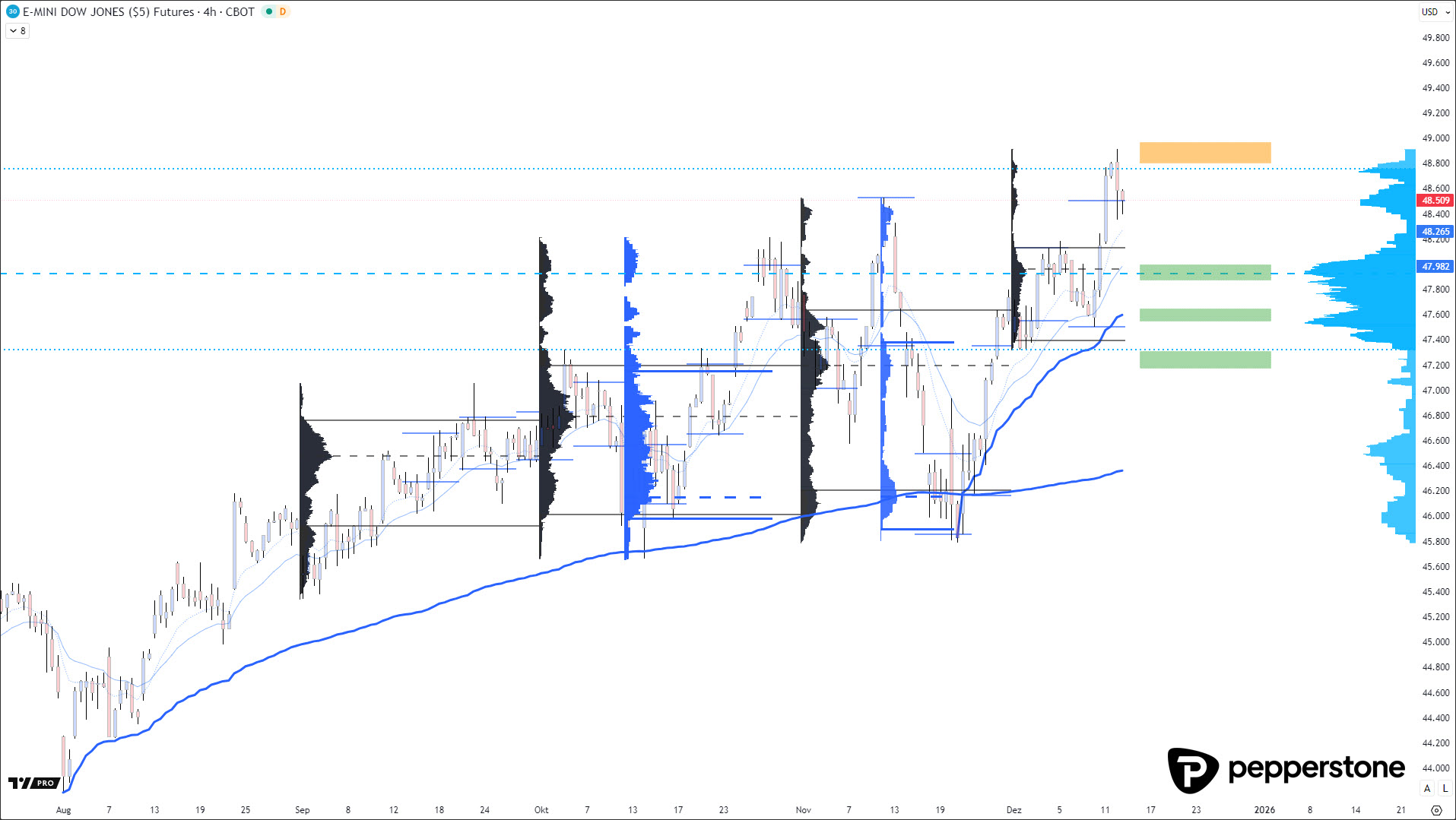 Für potenzielle Long-Ansätze fokussiere ich mich daher ausschließlich auf klar definierte Rücklaufzonen. Ein erster relevanter Bereich liegt am Point of Control des laufenden Impulses bei rund 47.930 Punkten. Darunter rückt der Bereich um 47.620 Punkte in den Fokus, wo sich sowohl ein volumengewichteter Durchschnitt als auch die Value Area High des Vormonats überlagern und damit eine technisch saubere Unterstützungszone bilden können.