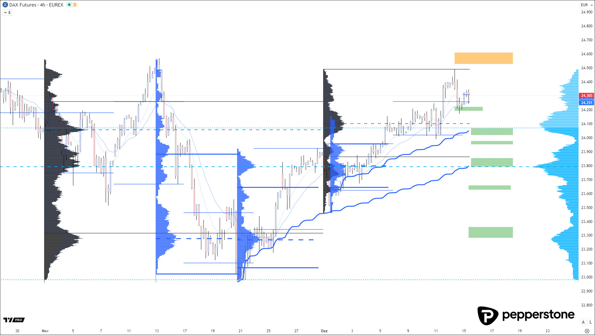 Short-Positionen ergeben in diesem Umfeld nur dann Sinn, wenn es zu einer eindeutigen Überdehnung kommt. Ein potenzieller Bereich dafür liegt an der Value Area High auf Drei-Monats-Basis, beginnend ab etwa 24.570 Punkten. Erst dort würde sich das Chancen-Risiko-Verhältnis zugunsten kurzfristiger Gegenbewegungen verschieben, vorausgesetzt, der Markt zeigt dort klare Schwächesignale.