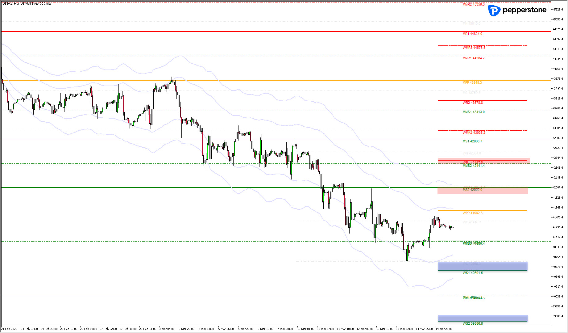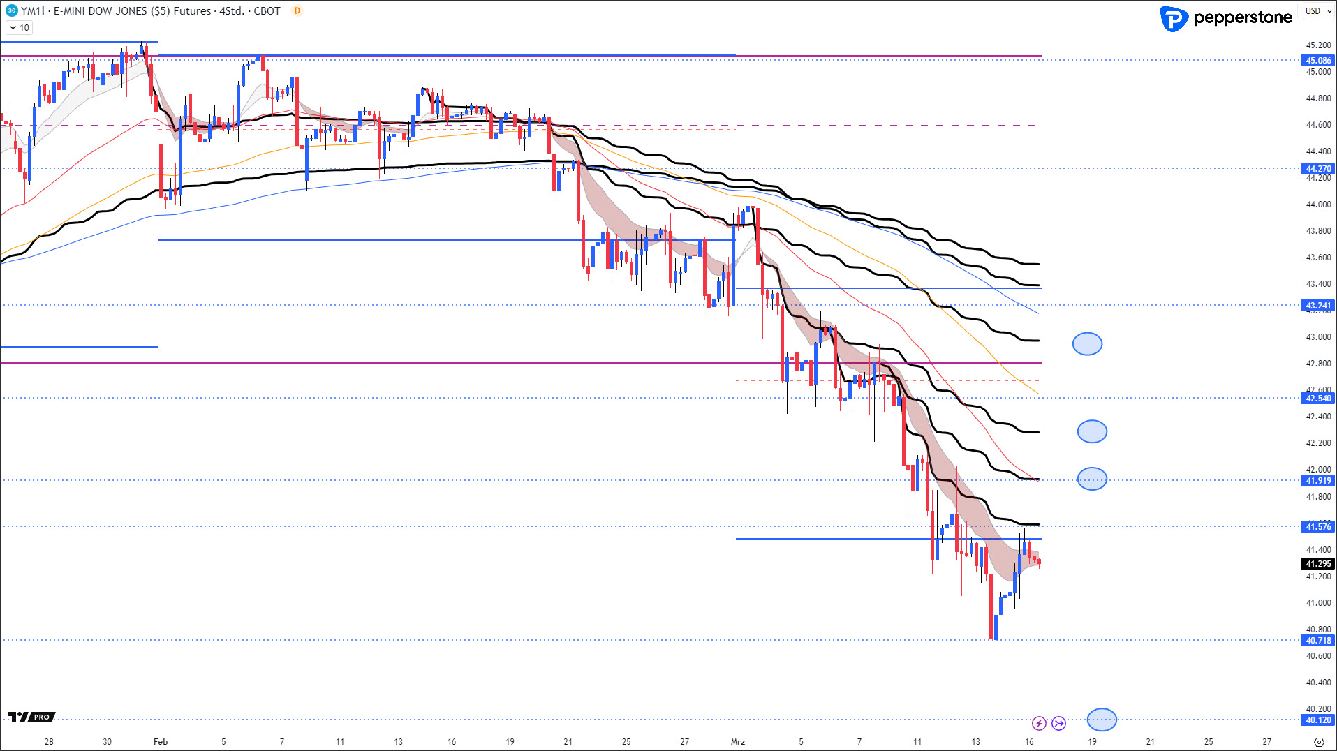 Shortpositionen gehe ich nur an den entsprechenden drei hervorgehobenen Zonen ein. Longpositionen sind aufgrund des fallenden H4-Momentums gegenwärtig keine Option. Mit einer deutlichen Überdehnung in die tiefe Unterstützung von 40.100 – 39.800 Punkten wäre ein Longtrade denkbar.