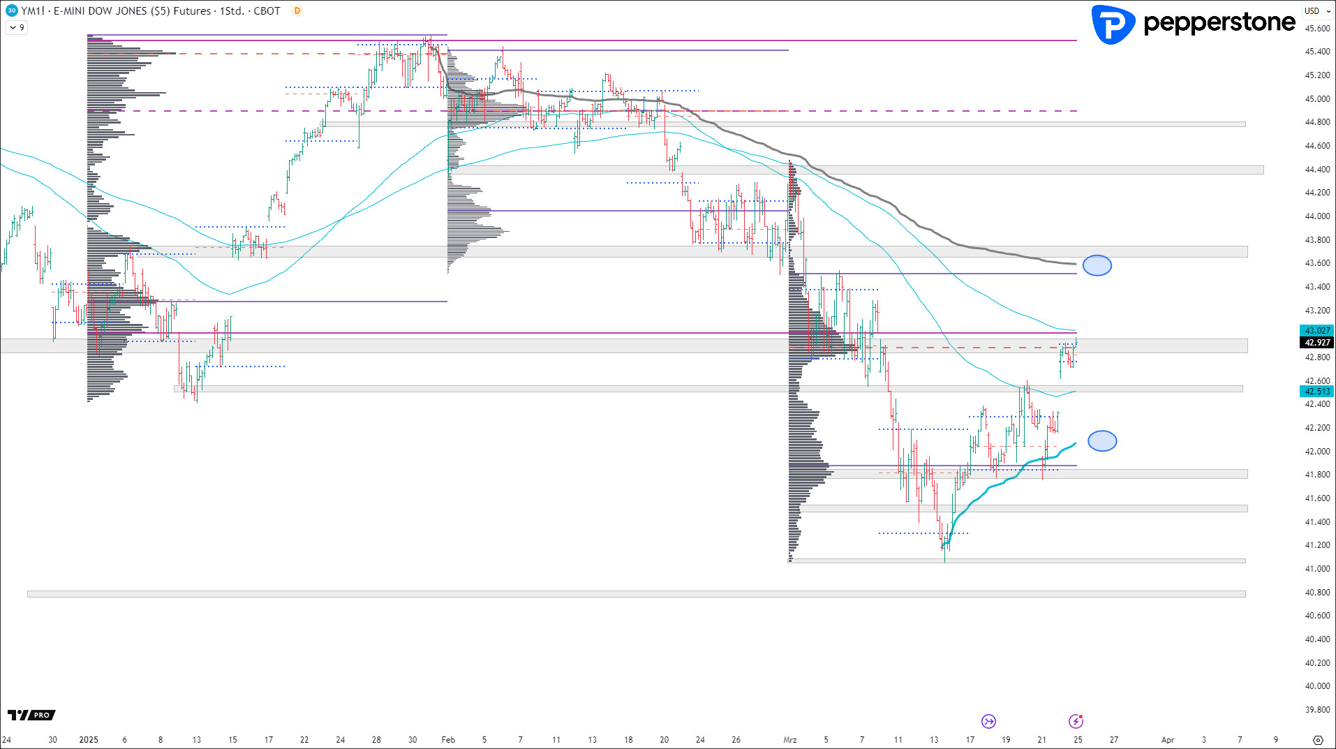 Eine Short-AVWAP wurde abgearbeitet und konnte eine kleine Kursreaktion erzeugen. Damit bleiben noch 2 AVWAPS übrig. Ein Volumendurchschnitt auf der Oberseite bei 43.240 Punkten und ein Volumendurchschnitt bei 41.870 Punkten.