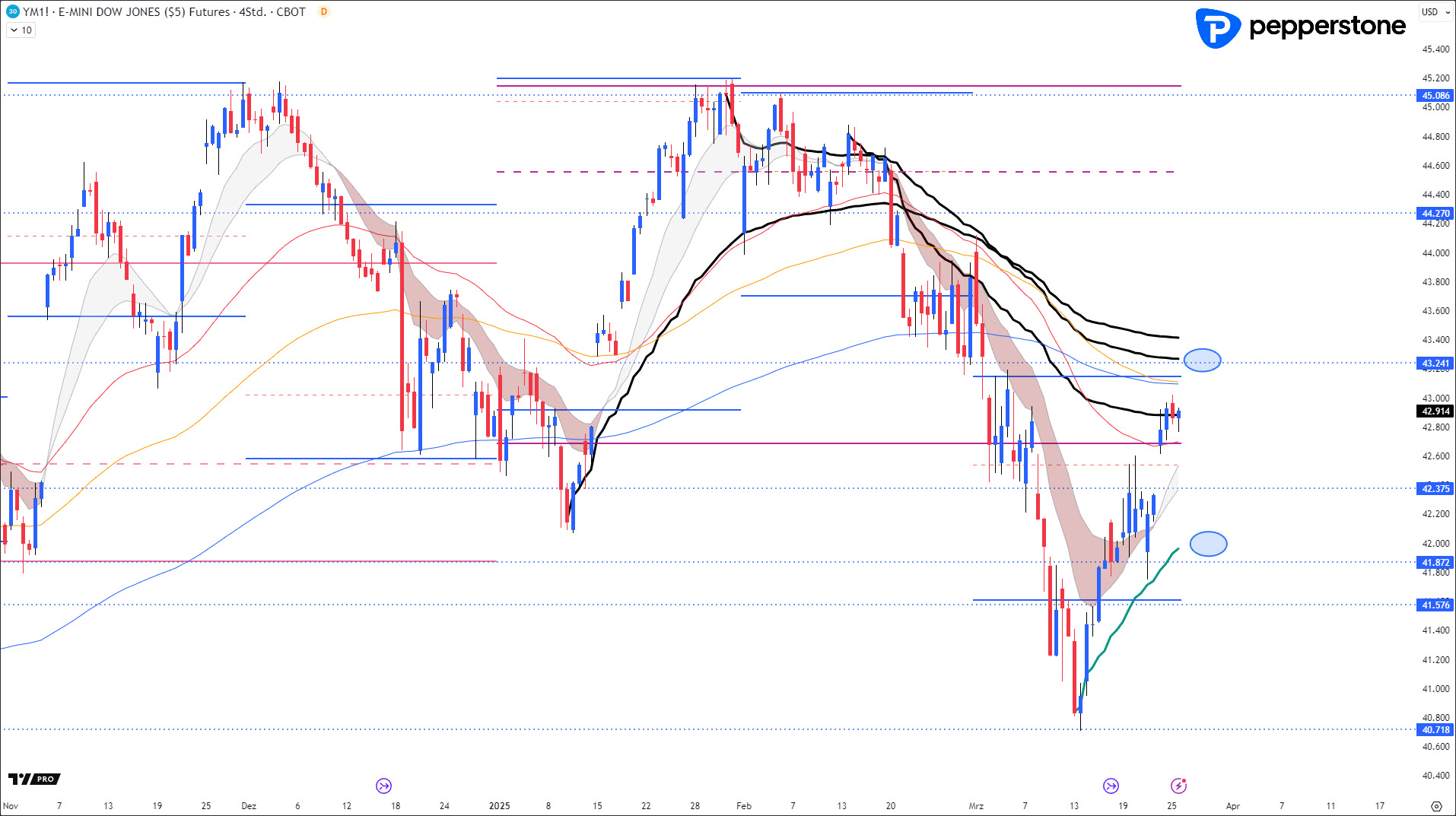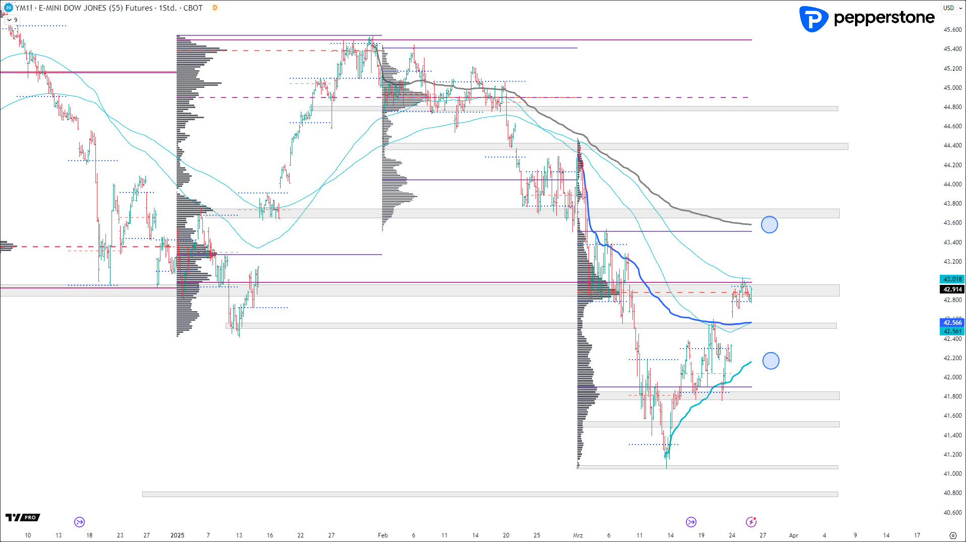 Unveränderte Situation: Eine Short-AVWAP wurde abgearbeitet und konnte eine kleine Kursreaktion erzeugen. Damit bleiben noch 2 AVWAPS übrig. Ein Volumendurchschnitt auf der Oberseite bei 43.240 Punkten und ein Volumendurchschnitt bei 41.870 Punkten.