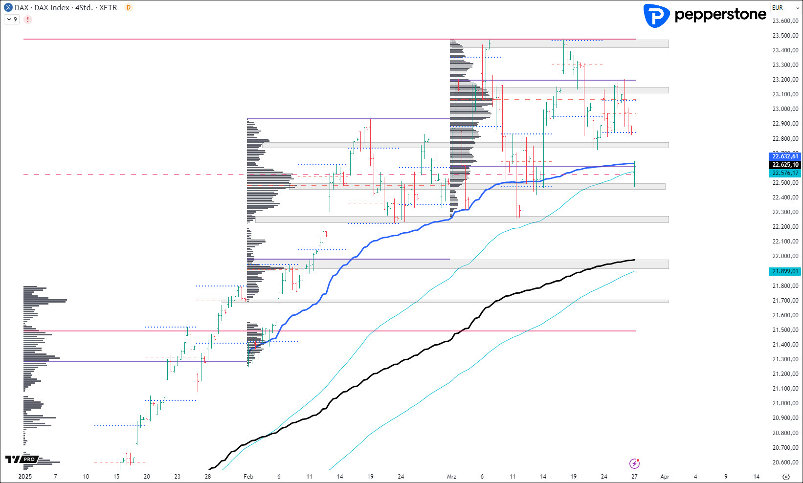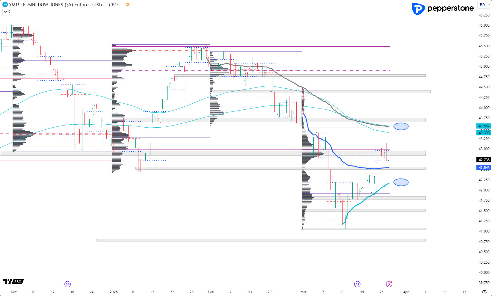 Unveränderte Situation: Eine Short-AVWAP wurde abgearbeitet und konnte eine kleine Kursreaktion erzeugen. Damit bleiben noch 2 AVWAPS übrig. Ein Volumendurchschnitt auf der Oberseite bei 43.240 Punkten und ein Volumendurchschnitt bei 41.870 Punkten.