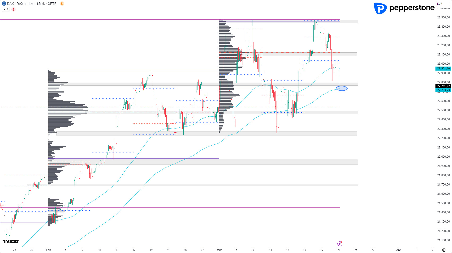 Kurze unterhalb der VAL (Value Area Low) als auch an der H4-EMA-100 sollten interessant werden. Kommt es untergeordnet zu Umkehrsignalen, bieten sich Kaufpositionen an.