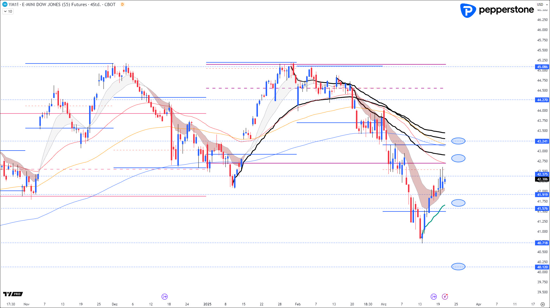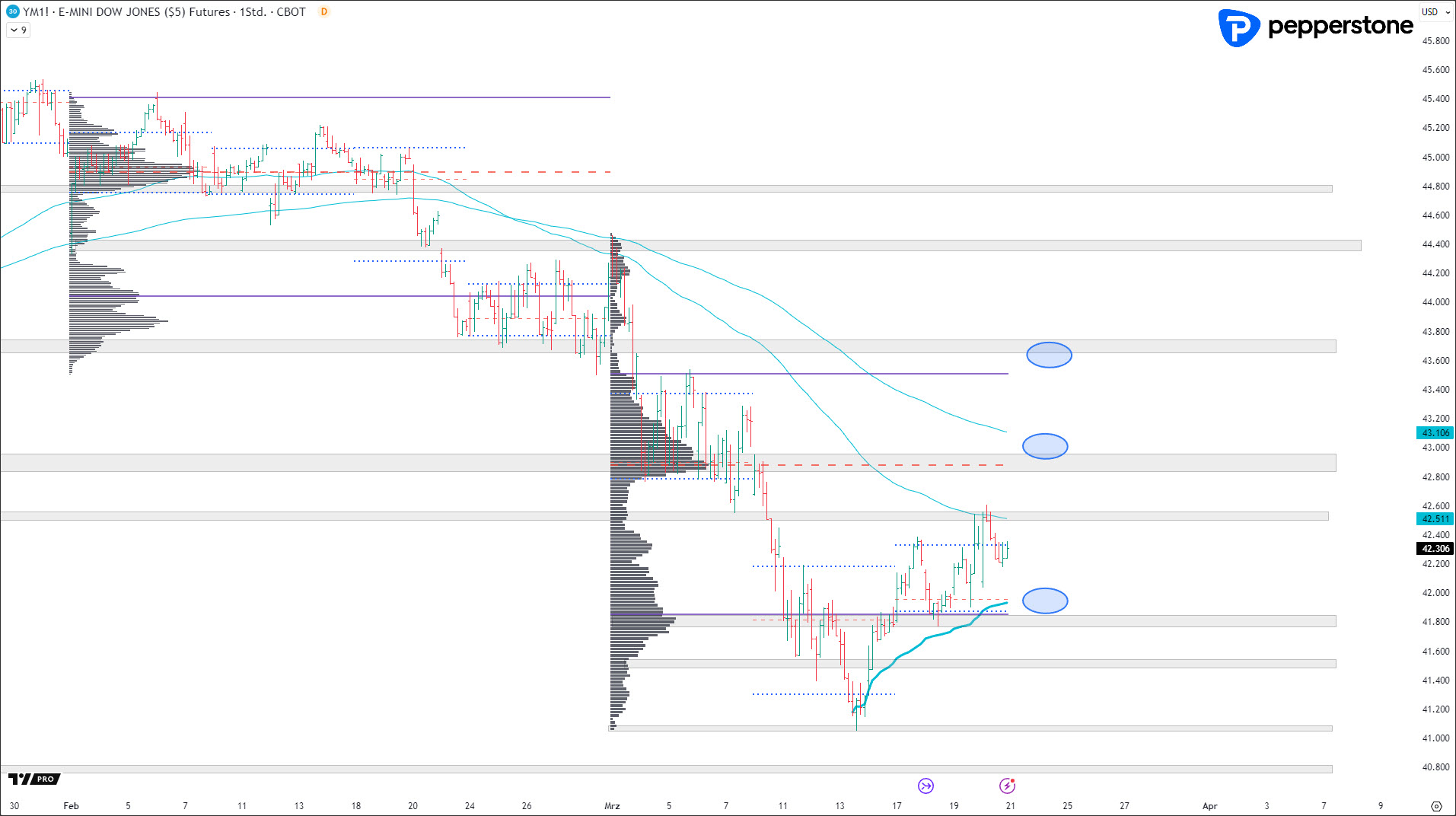 Weiterhin bin ich nur bereit Kaufpositionen an der unteren steigenden Anchored VWAP aufzubauen oder Shortpositionen an den fallenden AVWAPS im Bereich von 42.800 Punkten.