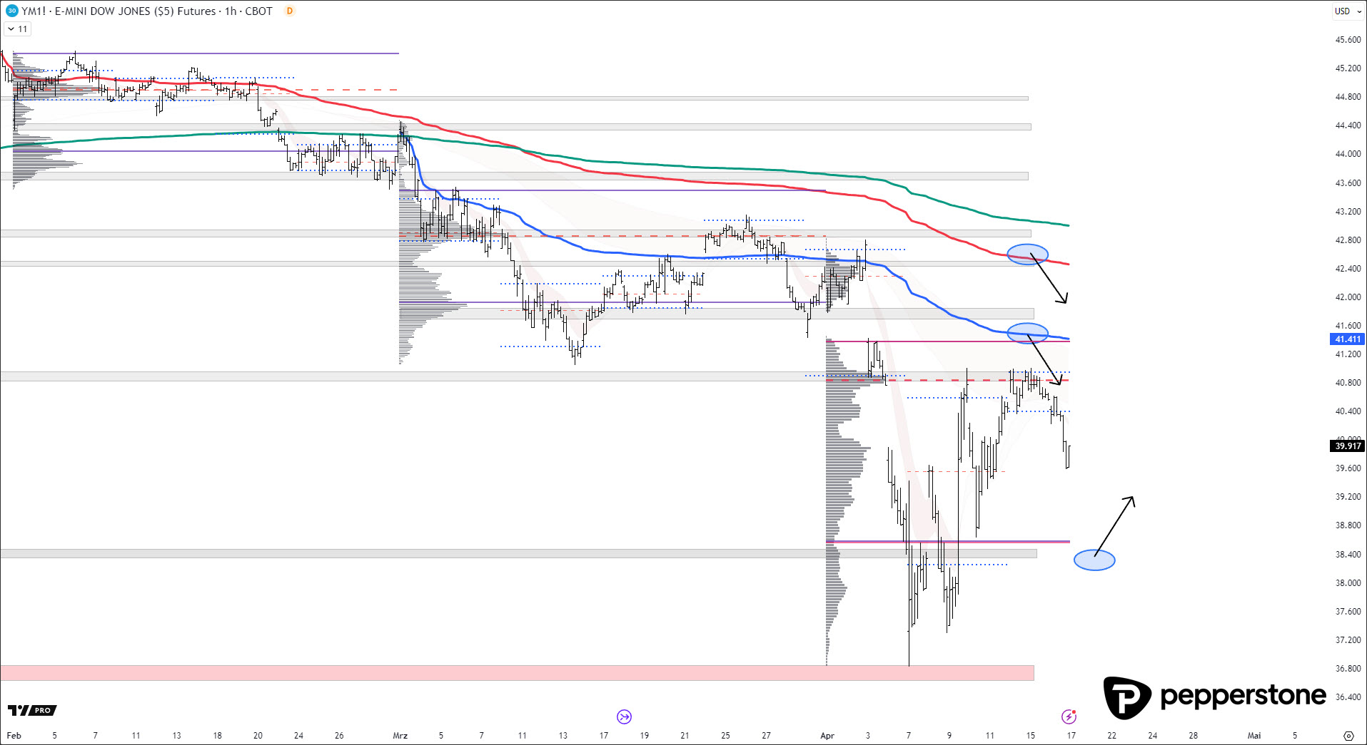 DOW JONES PROGNOSE: Die untere AVWAP wurde angelaufen, der Markt drehte auch hier planbar (eng stoppbar) und vollzog damit das Setup punktgenau. Weitere Zonen sind eingezeichnet.
