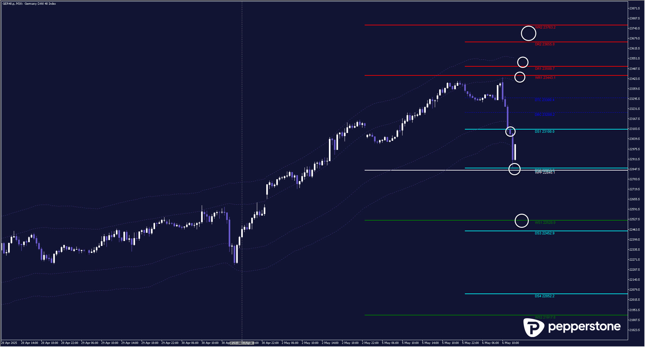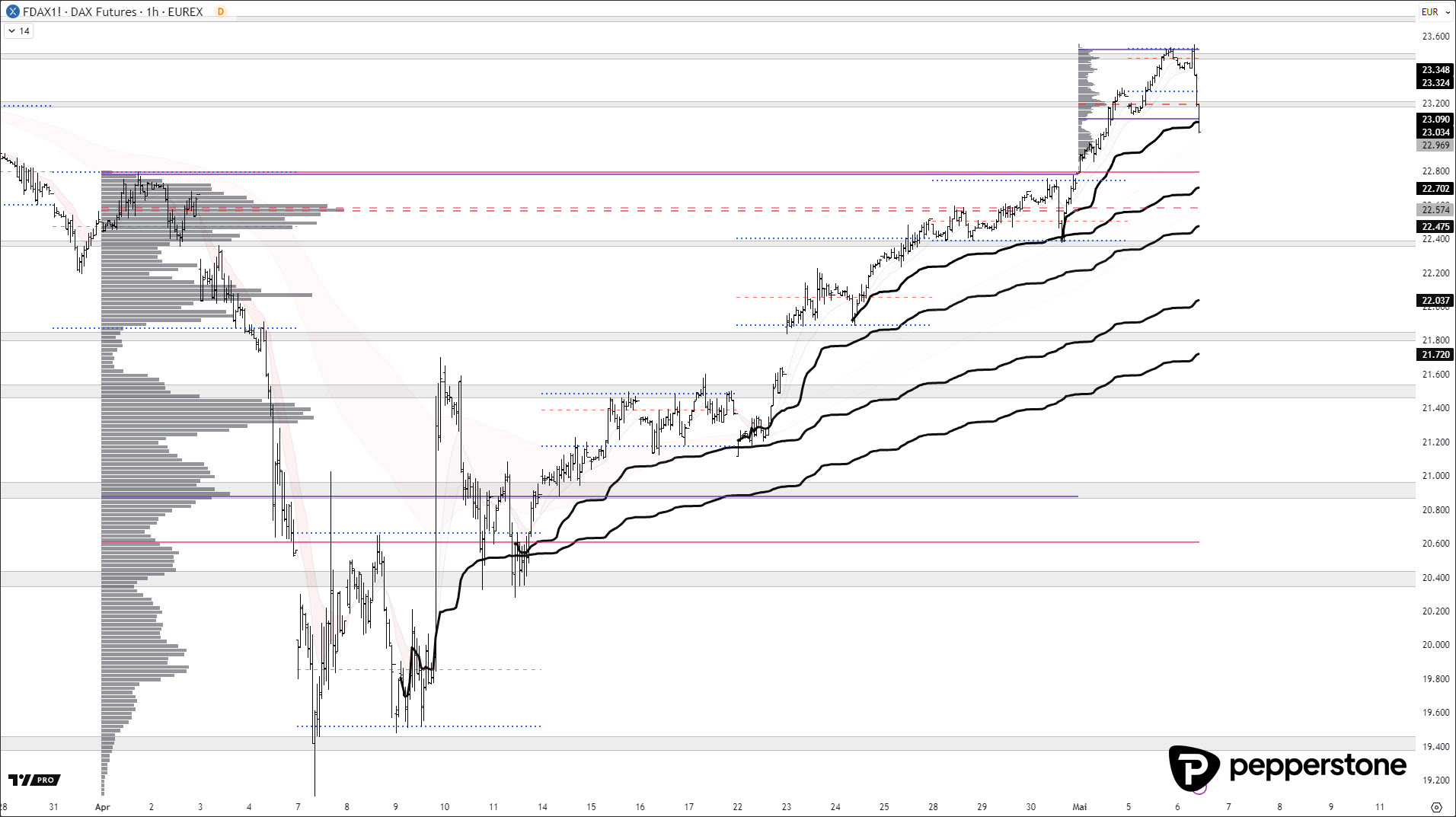 DAX PROGNOSE: Nach dem Allzeithoch ist nun ein Rücklauf in die Supportzonen zu erwarten. Vorrangig stehen die Anchored VWAPS als auch die hervorgehobenen Pivotcluster (dritter Chart) im Fokus. Erinnerung: auf dem untergeordneten Zeitfenster, S5 (5-Sekunden-Chart), S15 oder S30 sollte eine klare Ausbruchsformation zu erkennen sein, damit man nicht in fallende Messer kauft.