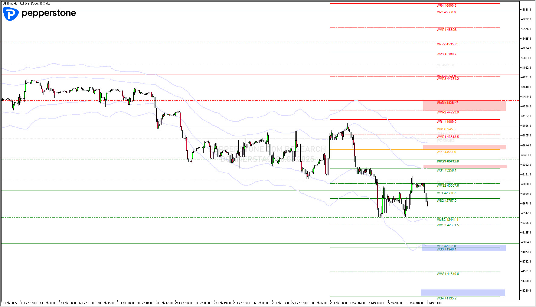 Im Dow Jones erwarte ich weiterhin eine Liquiditätsfalle mit Absorption unter den gegenwärtigen sichtbaren Unterstützungen aus H1 / H4 – Chart. Bedeutet: weiterhin Schwäche bis unter die Marke von 41.960 Punkten, bevor ein nachhaltiger Boden entstehen könnte.