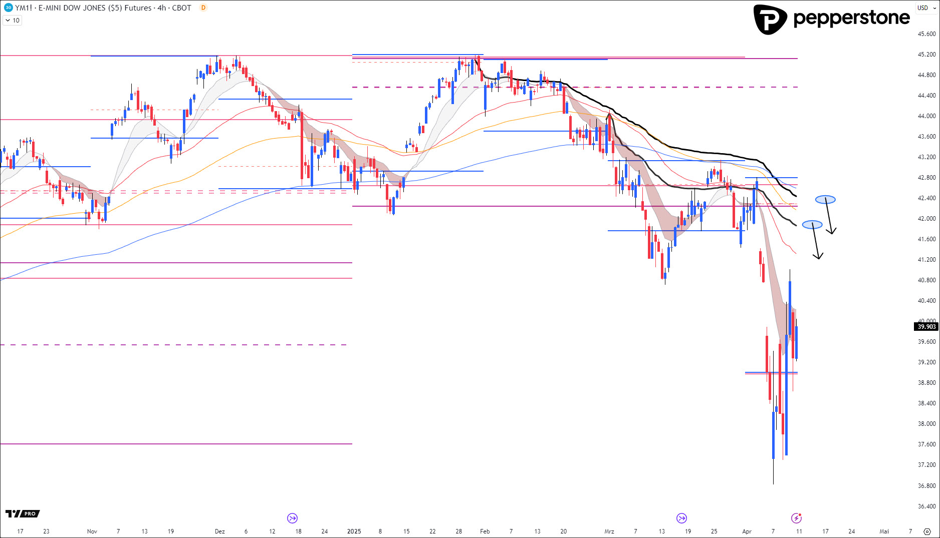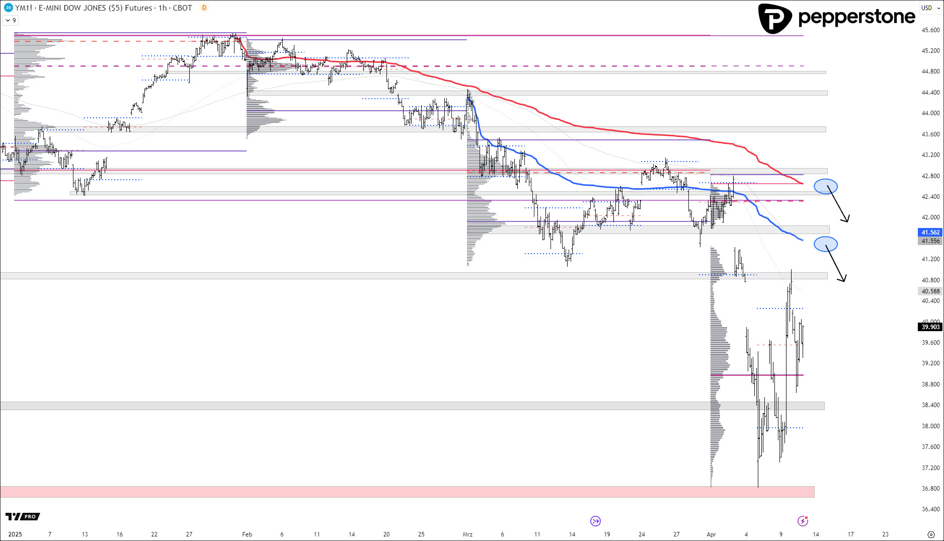 DOW JONES PROGNOSE: Situation unverändert. Ich warte auf die oberen zwei AVWAP-Zonen, die farblich hervorgehoben wurden.