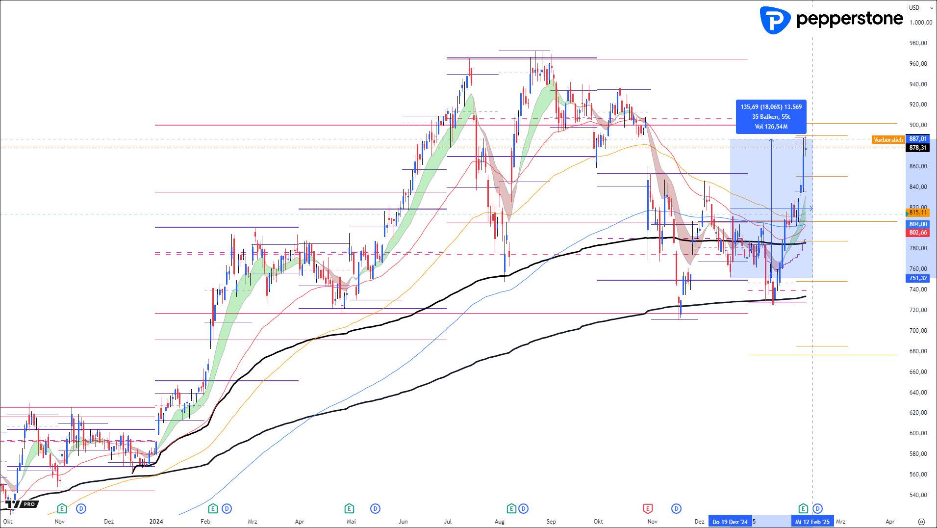 Fast 20 Prozent konnte die Aktie von ELI LILLY hier an den volumengewichteten Durchschnitten erzeugen. Kurzfristig etwas überhitzt, könnten nun kleinere Korrekturen einsetzen, die für erneute Einstiege interessant sind!