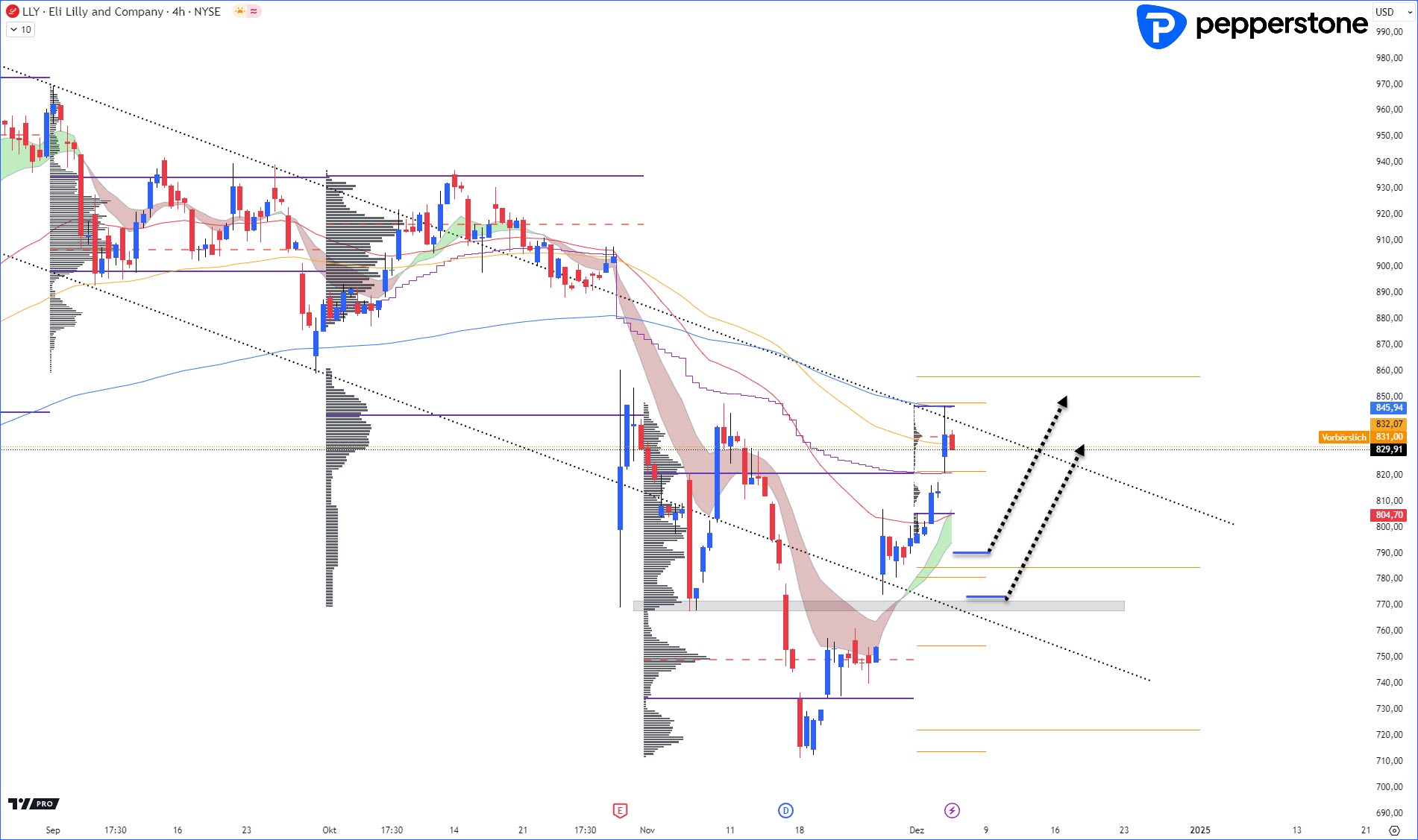 Lange Zeit liefen viele Pharmaschwergewichte stringent nur nach oben. „The sky is the limit“ war lange das Motto. Mit Donald Trump als Wahlsieger crashte der Gesundheitssektor deutlich, die Korrektur der Pharmaaktien begann. ELLI LILLY schoss in diesem Zuge weit über die Tages-EMA-200 und fand dann in der naheliegenden wichtigen Anchored VWAP (volumengewichteter Durchschnitt) einen Boden. Interessant wird jetzt der ungeordnete Blick auf den H4-Chart.