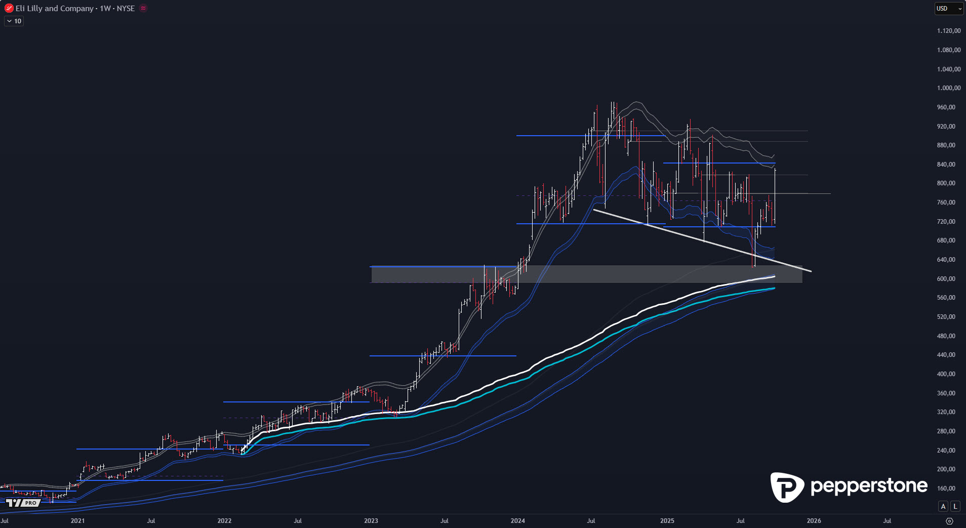 Was wir derzeit sehen, ist vor allem die Korrektur einer außergewöhnlich starken Rallye. Von etwa 307 USD ausgehend stieg die Aktie auf über 974 USD – ein Plus von mehr als 213 % in einer Pharmaaktie. Solche Bewegungen sind klar überdehnt und neigen zu gesunden Rücksetzern. Die aktuelle Schwächephase passt daher ins übergeordnete Bild und muss nicht zwingend als Trendbruch interpretiert werden. Vielmehr kann sie die Basis für einen neuen, nachhaltigeren Aufwärtsschub bilden.