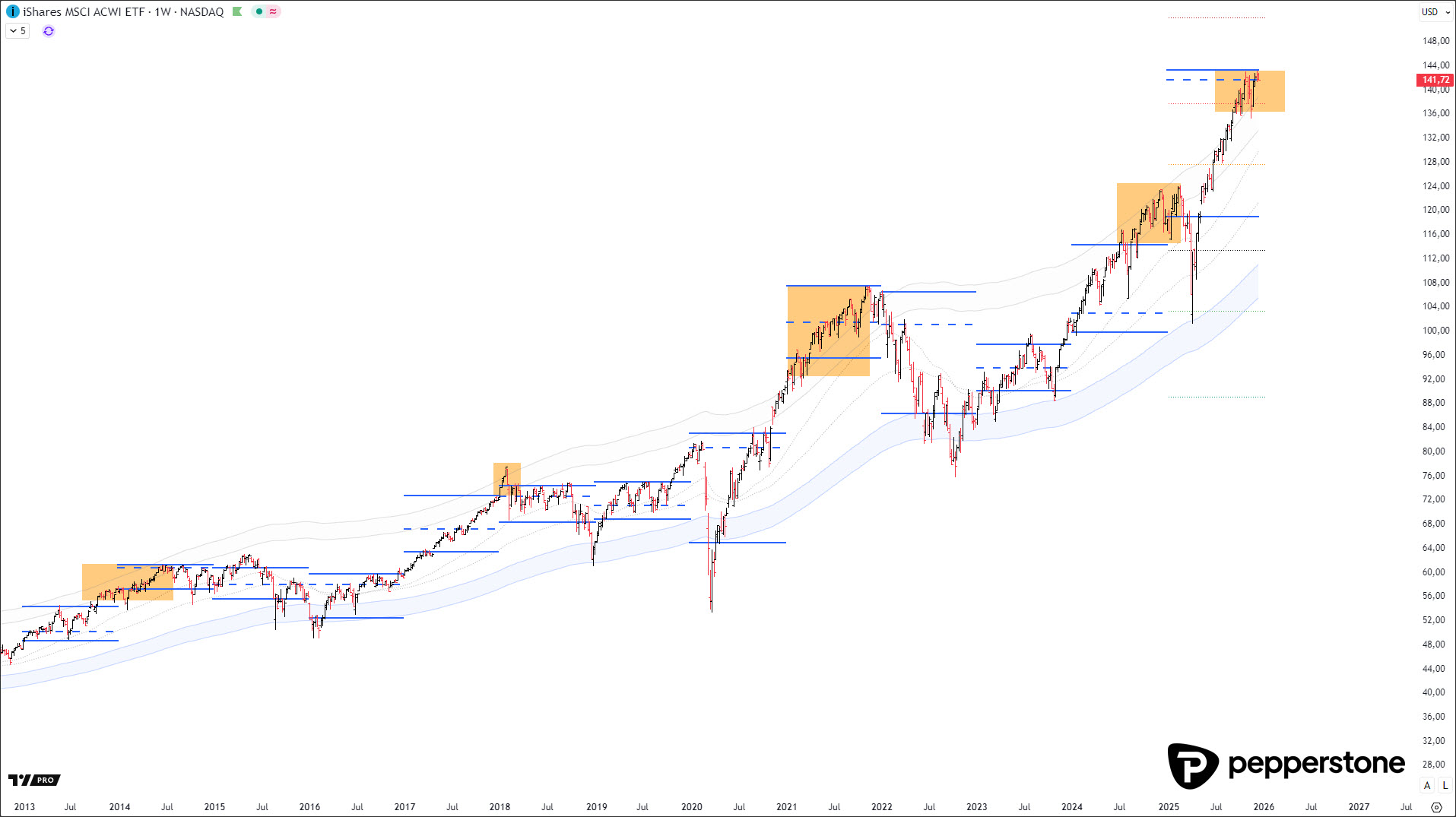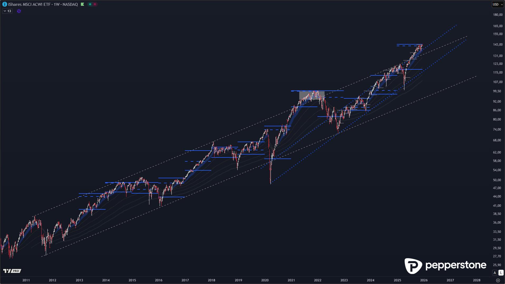 Unabhängig davon, ob die Anpassung kurzfristig über eine Korrektur oder zunächst über eine längere Seitwärtsphase erfolgt, bleibt der Markt aus mittelfristiger Sicht teuer. Auch wenn neue Hochs nie ausgeschlossen werden können, zeigen vergleichbare Übergangsphasen der Vergangenheit, dass spätere Einstiegsmöglichkeiten oft günstiger ausfallen. Für den MSCI World liegen aus heutiger Sicht attraktivere Zonen eher im Bereich von 125, perspektivisch auch 120 oder 110 Punkten. Diese Marken müssen nicht kurzfristig erreicht werden, definieren aber ein realistisches Zielband für eine erneute strategische Positionierung. Die grundsätzliche Aussage gilt dabei nicht nur für den MSCI World, sondern ebenso für andere große Indizes wie S&P 500, Nasdaq, Dow Jones oder DAX.