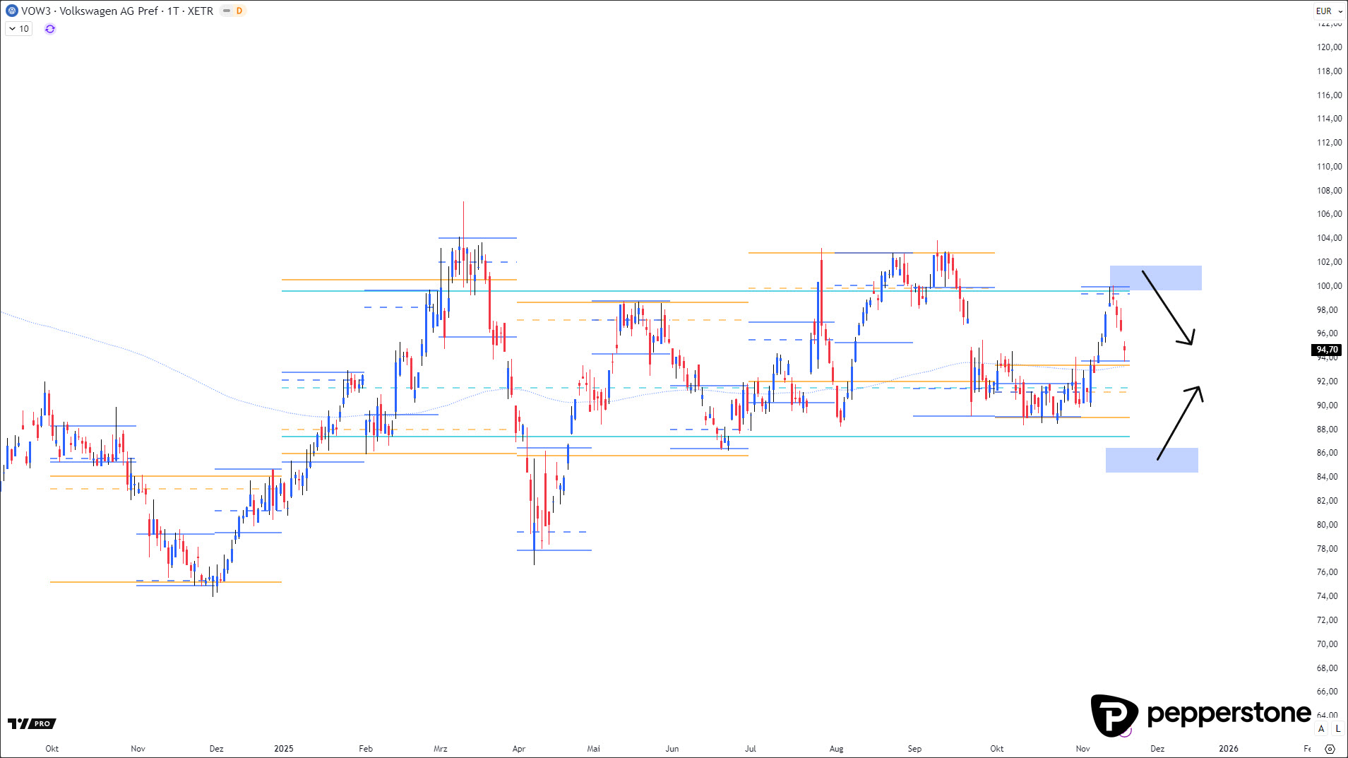 Im deutschen Einzelwertbereich zeigt Volkswagen weiterhin eine technisch saubere und institutionell geformte Seitwärtsrange. Die Value Area erstreckt sich zwischen ca. 88 und 100 EUR und dient seit Monaten als klarer Balance-Bereich des Titels.