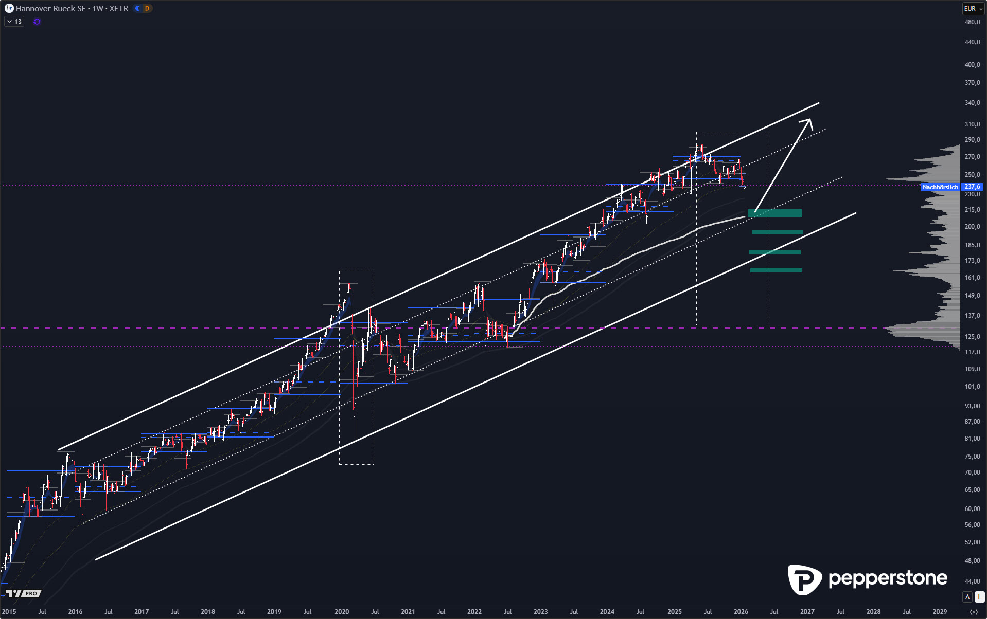 Mit dem aktuellen Rücklauf nähert sich die Hannover Rück wieder Bereichen, die aus institutioneller Sicht zunehmend interessant werden. Unterhalb der früheren Value Area High entsteht wieder Preisakzeptanz, während sich zusätzlich ein volumengewichteter Durchschnitt auf Schlusskursbasis im Bereich um 210 Euro befindet. Diese Konfluenz aus Trendkanal und Volumenstruktur definiert eine Zone, in der mittelfristig neue Positionierungen attraktiv werden können. Selbst weitere Schwäche wäre in diesem Kontext kein Warnsignal, sondern Teil des Korrekturprozesses.