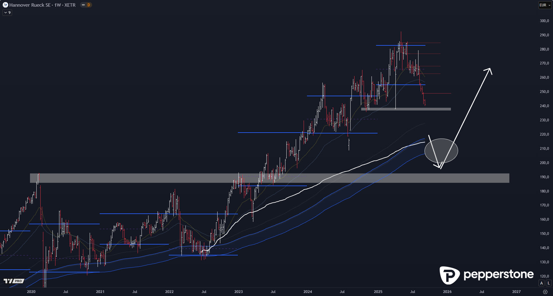 Ein Blick zurück bestätigt dieses Muster. Bereits 2020 analysierte ich die Hannover Rück im Bereich um 118 Euro, als die Aktie in einer tiefen Korrektur notierte und von vielen Anlegern als „langweilig“ abgetan wurde. Kurz darauf folgte jedoch eine deutliche Trendfortsetzung, die langfristig sehr profitabel war. Die aktuelle Konstellation weist frappierende Parallelen auf: eine lange Rallye, gefolgt von einer unterschätzten Korrekturphase, in der das Marktinteresse nachlässt. Genau solche Situationen sind es, die später zu überdurchschnittlicher Performance führen können, wenn man die Geduld aufbringt, auf die richtige Bestätigung zu warten.